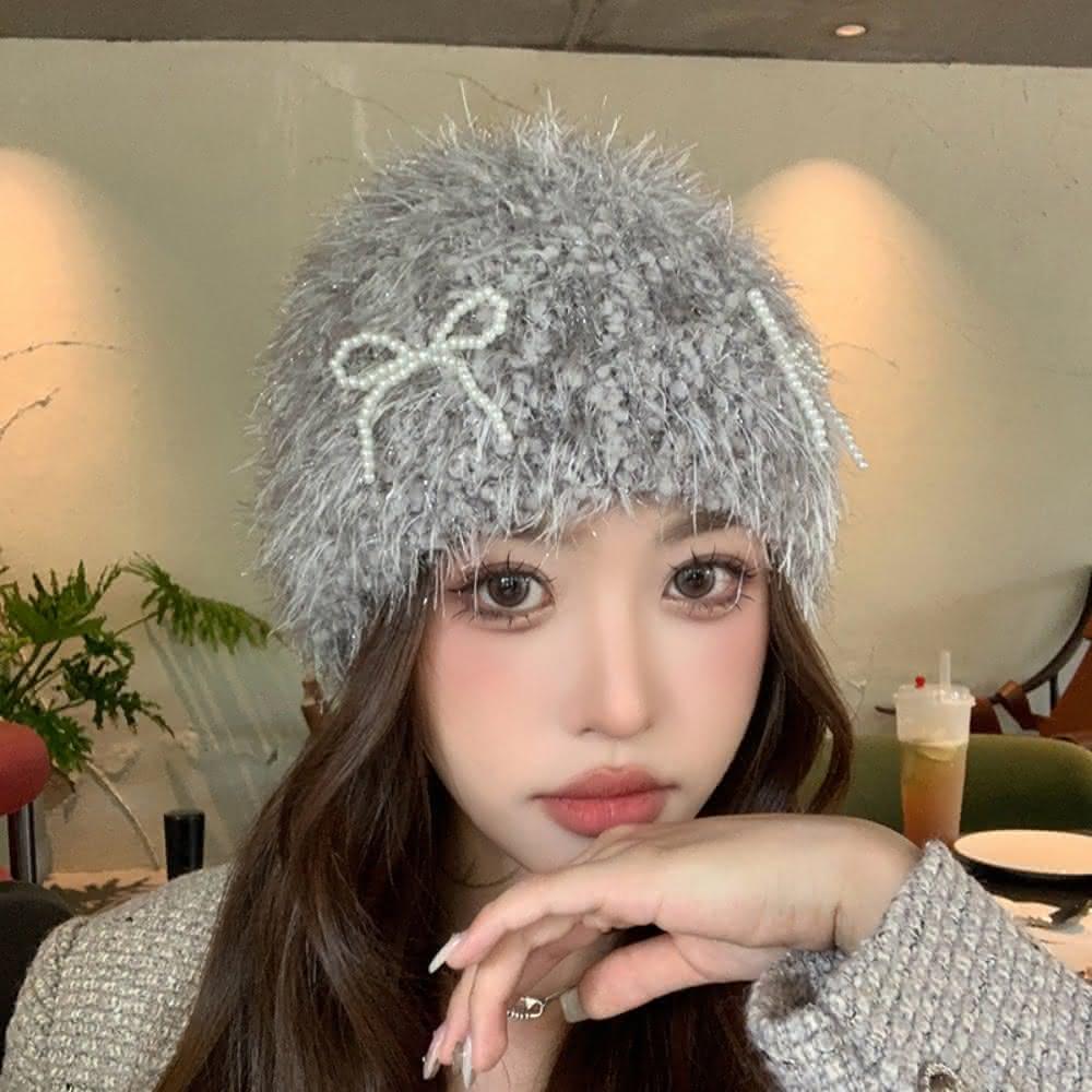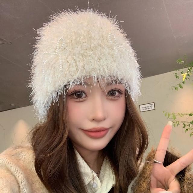 巴黎精品現貨+預購 毛帽針織帽-韓版INS風毛絨珍珠蝴蝶結包頭女帽子4色a1ip6
