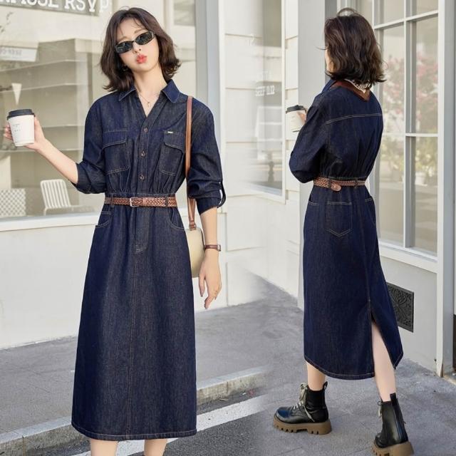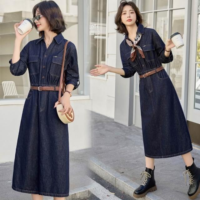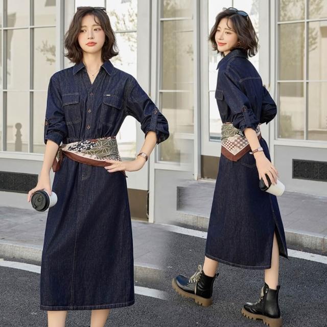 巴黎精品現貨+預購 韓風牛仔洋裝牛仔長裙丹寧套裝大碼休閒女裝(長袖翻領絲巾牛仔連身裙a1ln47)