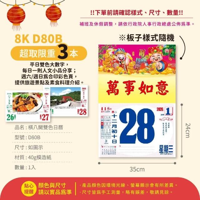 2026年 8K橫式彩色傳統日曆 (日曆 8開 手撕日曆 傳統日曆 掛式日曆 模造日曆)