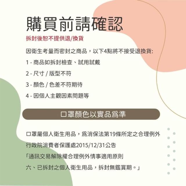 - 個人衛生用品除商品本身有瑕疵外,未拆封商品仍享有十天猶豫期之退貨權利。但已拆封 (如剪標、下水等情形…),依據《通訊交易解除權合理例外情事適用準則》第二條規定,商店無法接受退換貨。