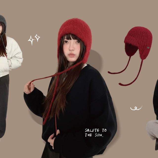 ZOII 佐壹韓版小橢圓標繫帶羊毛護耳帽 毛帽 羊毛帽 秋冬帽 針織帽 保暖帽 賞雪帽 護耳帽#109018