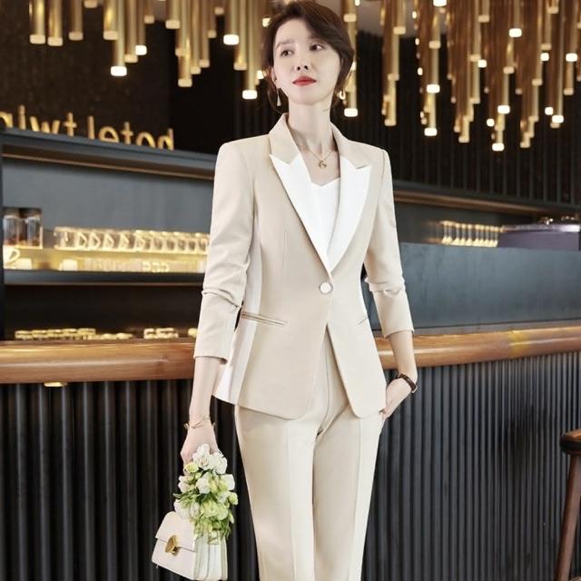 米蘭精品現貨+預購 西裝套裝兩件套撞色翻領外套長褲女職業西裝2色74ct56