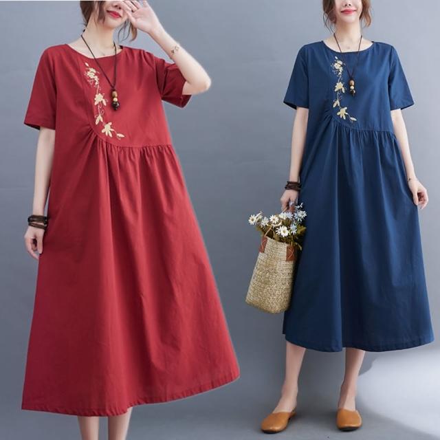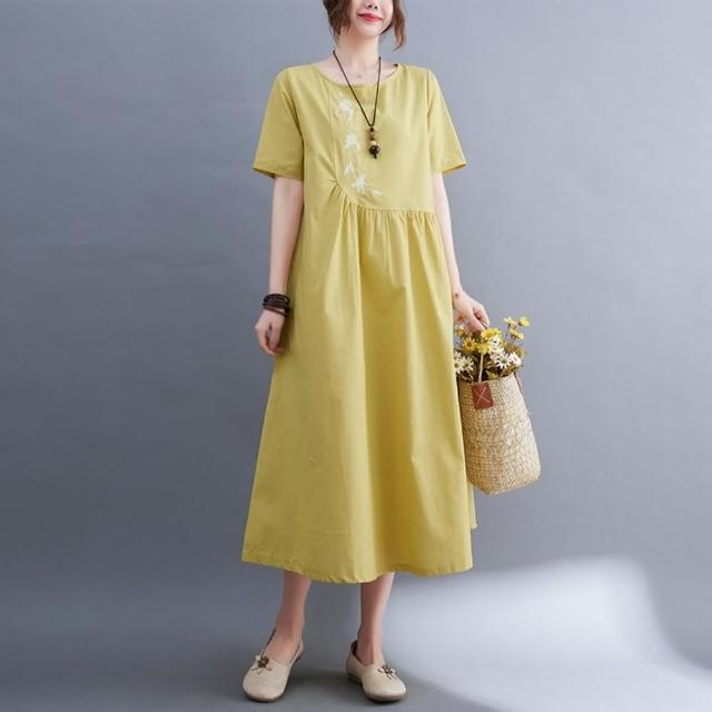 米蘭精品現貨+預購 女連身裙棉麻洋裝大尺碼長裙連衣裙夏季休閒大碼女裝-繡花寬鬆純色A字裙女裙子3色74cs73