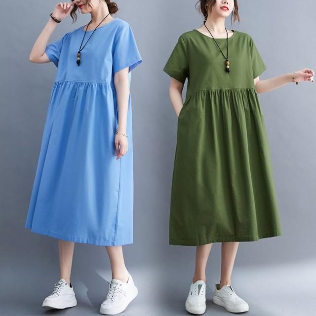 米蘭精品現貨+預購 女連身裙棉麻洋裝大尺碼長裙連衣裙夏季休閒大碼女裝-休閒純色寬鬆短袖女裙子4色74cs77