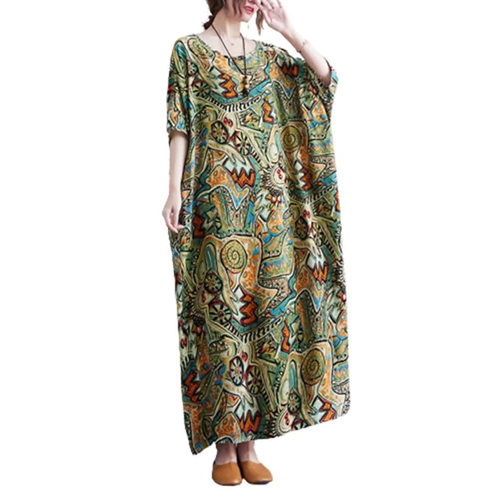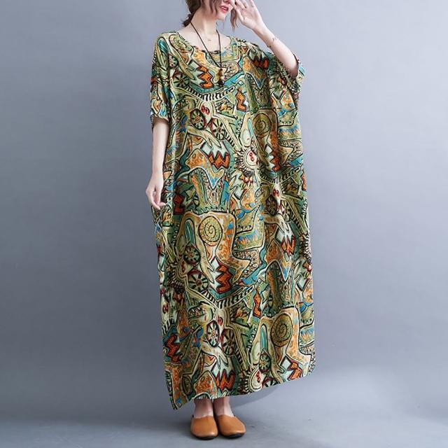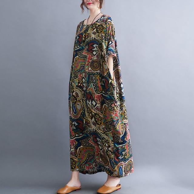 米蘭精品現貨+預購 女連身裙棉麻洋裝大尺碼長裙連衣裙夏季休閒大碼女裝-寬鬆民族風印花長款女裙子3色74cs87
