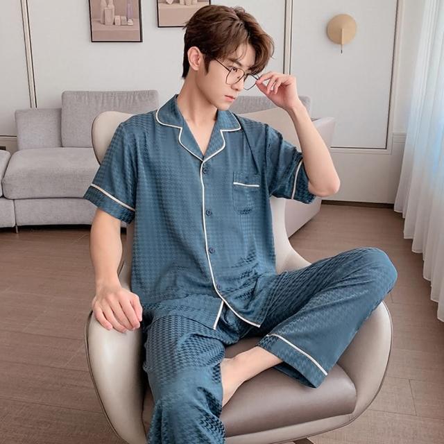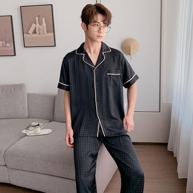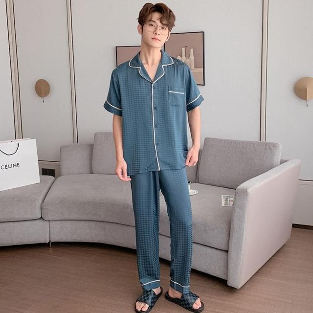米蘭精品現貨+預購 男絲質居家睡衣套裝緞面絲綢冰絲睡衣薄款短袖睡衣睡褲-格紋提花長褲2色74fv30