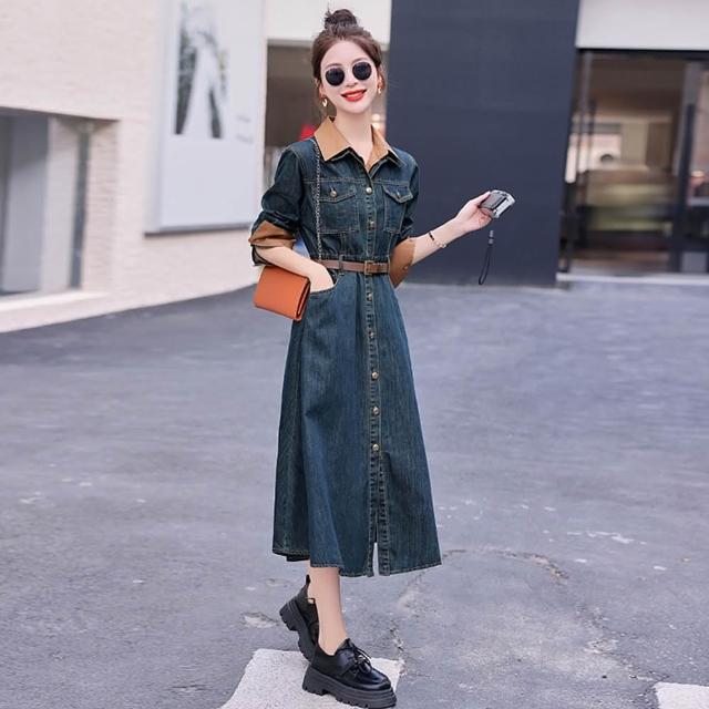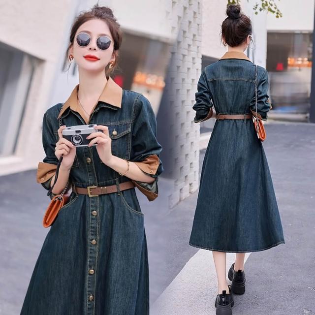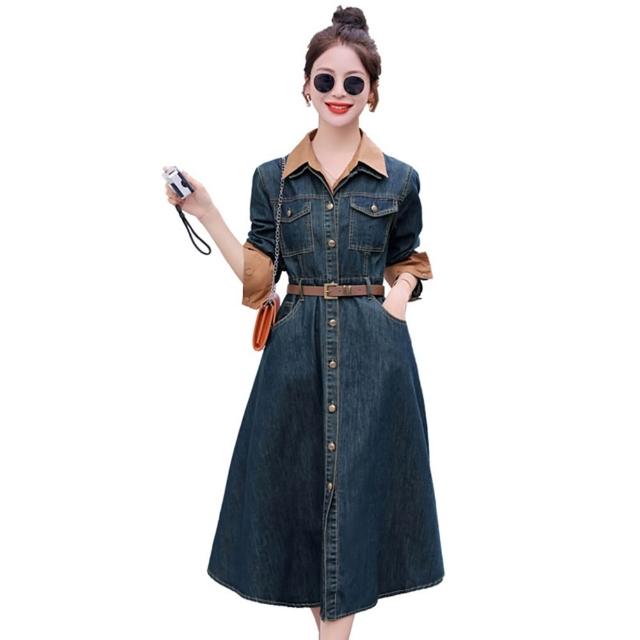 米蘭精品現貨出清 牛仔洋裝連身裙大尺碼長裙連衣裙A字裙休閒大碼女裝(法式氣質小眾翻領女裙子74ga26)