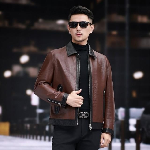 米蘭精品現貨+預購 真皮皮衣外套-牛皮撞色翻領鱷魚紋時尚高端男外套酒紅色74ja2