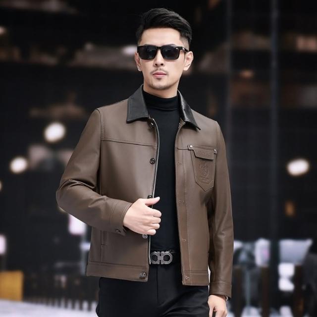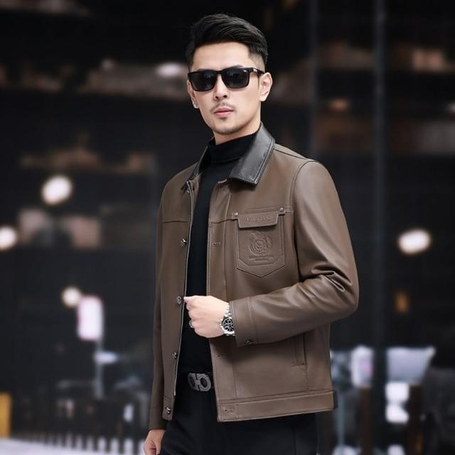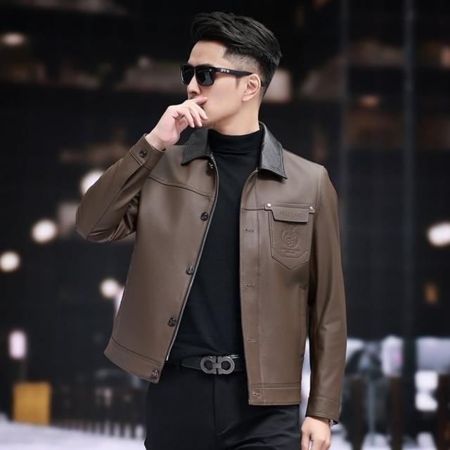 米蘭精品現貨+預購 真皮皮衣外套-頭層牛皮復古拼色翻領高級潮流男外套咖啡色74ja61