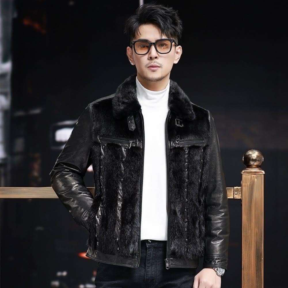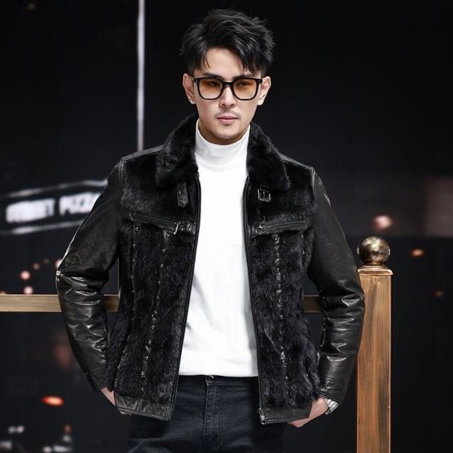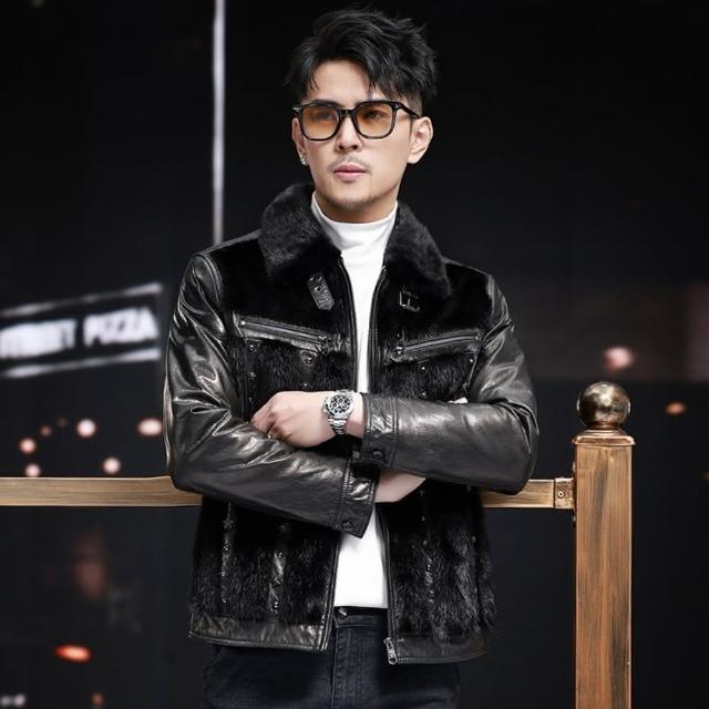 米蘭精品現貨+預購 真皮皮衣外套-油蠟牛皮短版水貂毛羽絨保暖男外套黑色74ja76