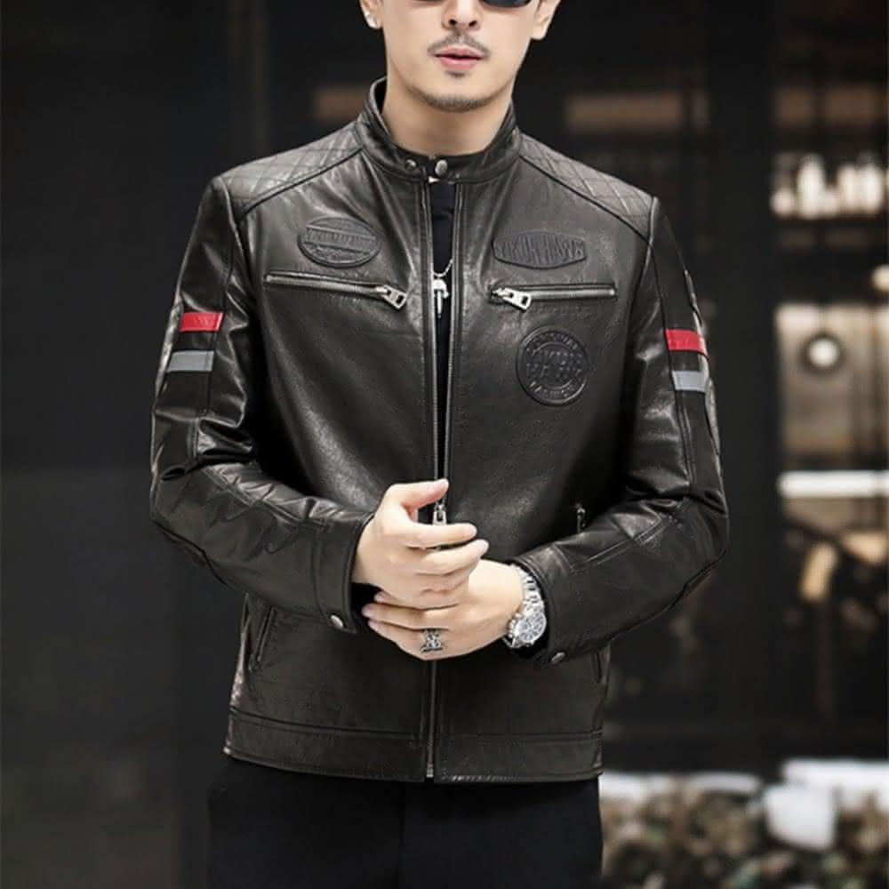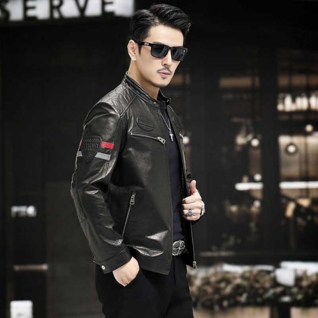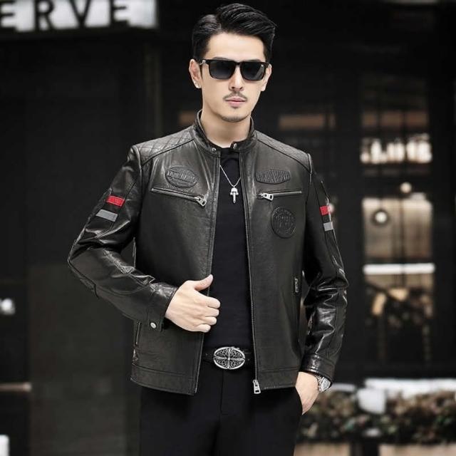 米蘭精品現貨+預購 真皮皮衣外套-山羊皮帥氣立領機車夾克壓紋LOGO男外套黑色74ja89