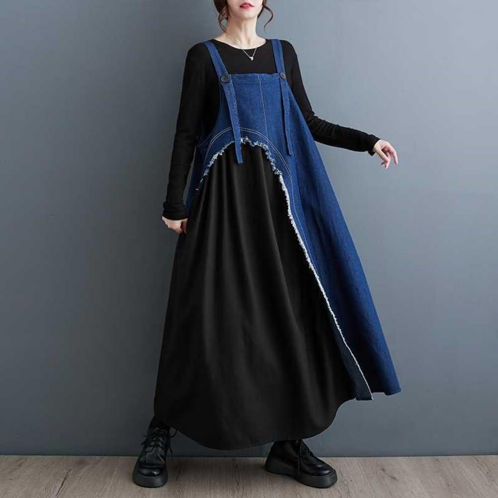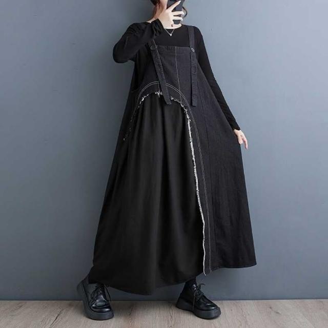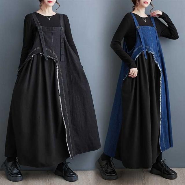 米蘭精品現貨+預購 洋裝長袖連身裙大尺碼長裙連衣裙A字裙休閒大碼女裝(時尚牛仔拼接女裙子2色74jb21)