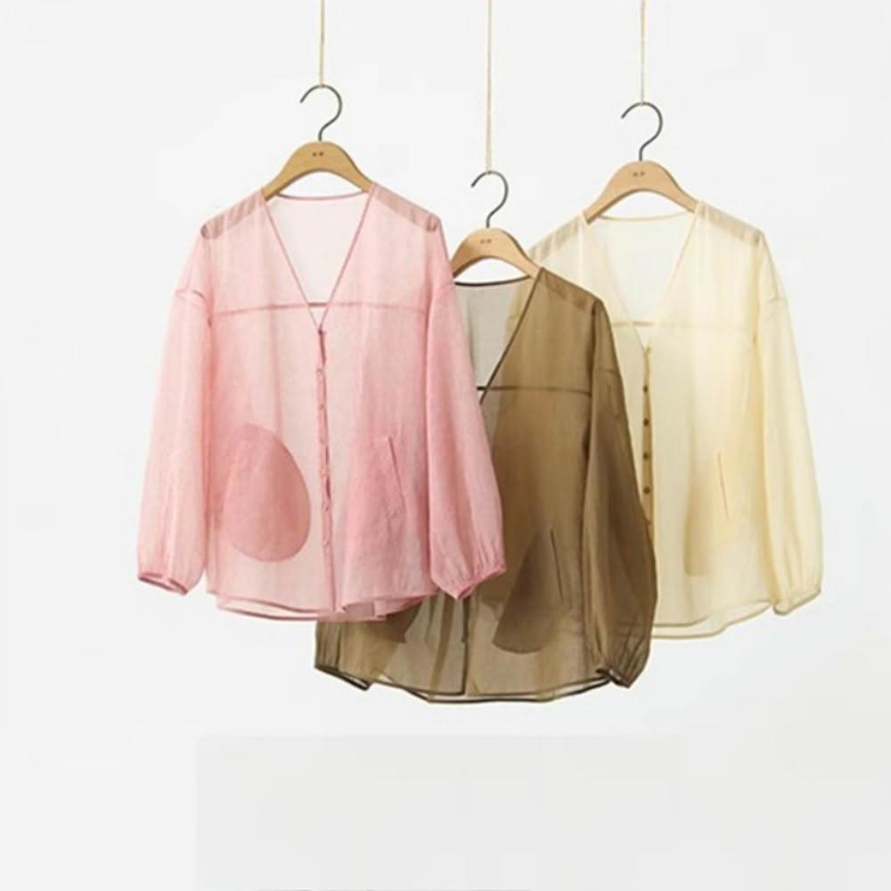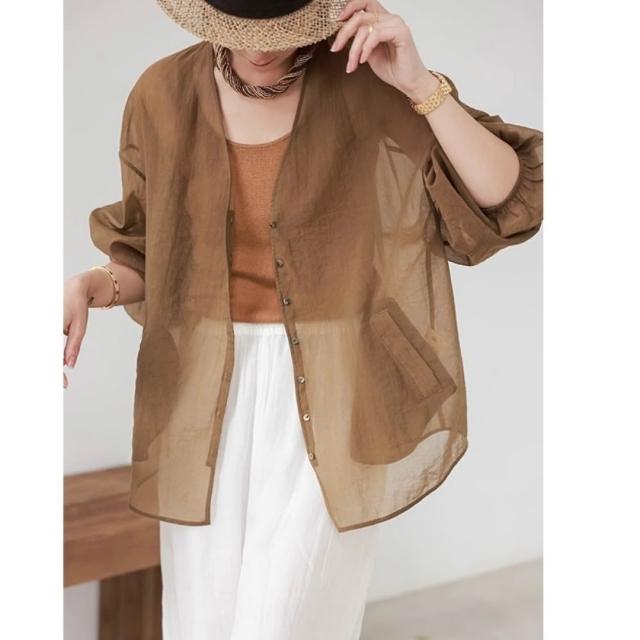 米蘭精品現貨+預購 防曬外套長袖罩衫-亞麻通透輕盈襯衫女裝3色74kc35