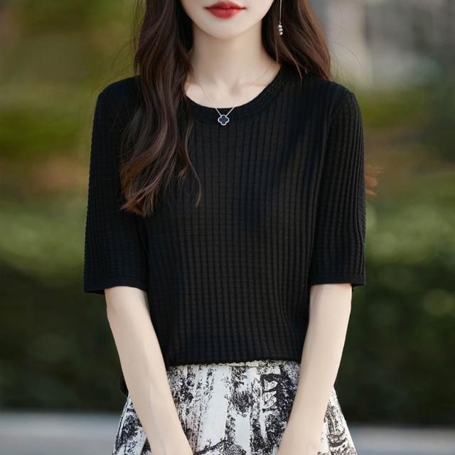 米蘭精品現貨+預購 針織衫短袖毛衣-格子天絲T恤純色女上衣4色74lc33