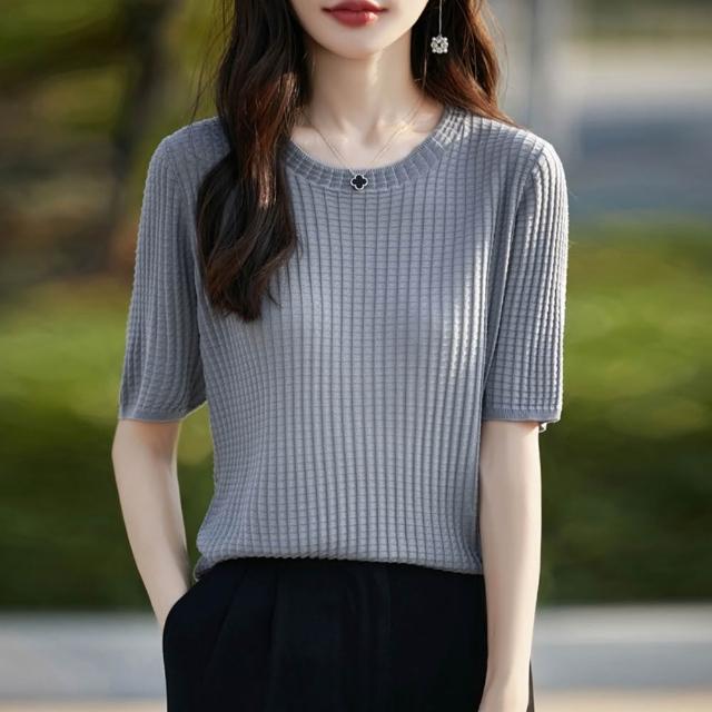 米蘭精品現貨+預購 針織衫短袖毛衣-格子天絲T恤純色女上衣4色74lc33