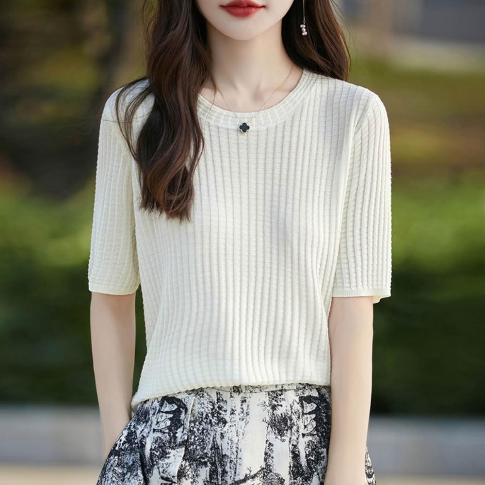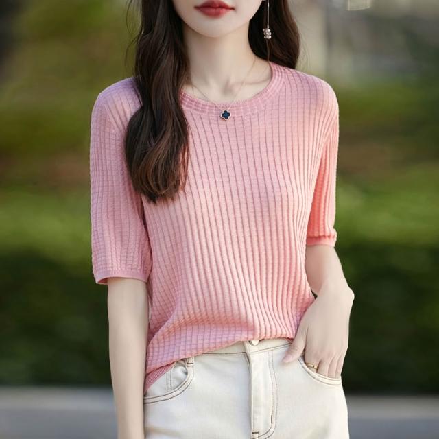 米蘭精品現貨+預購 針織衫短袖毛衣-格子天絲T恤純色女上衣4色74lc33