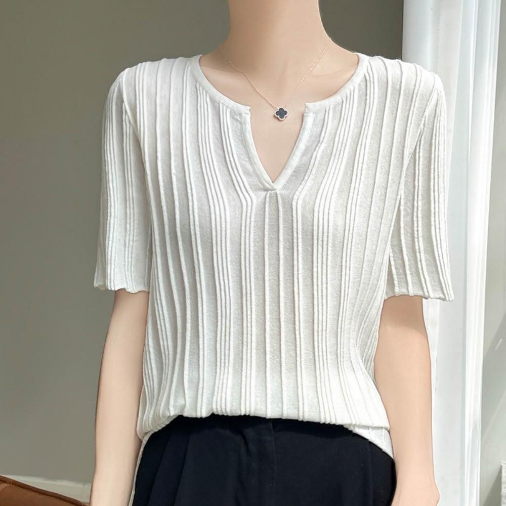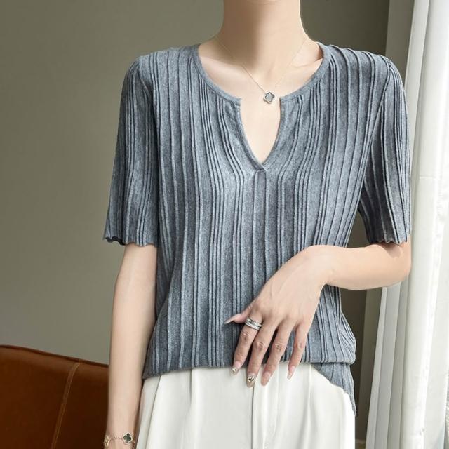 米蘭精品現貨+預購 針織衫短袖毛衣-設計感V領薄款T恤女上衣3色74lc60