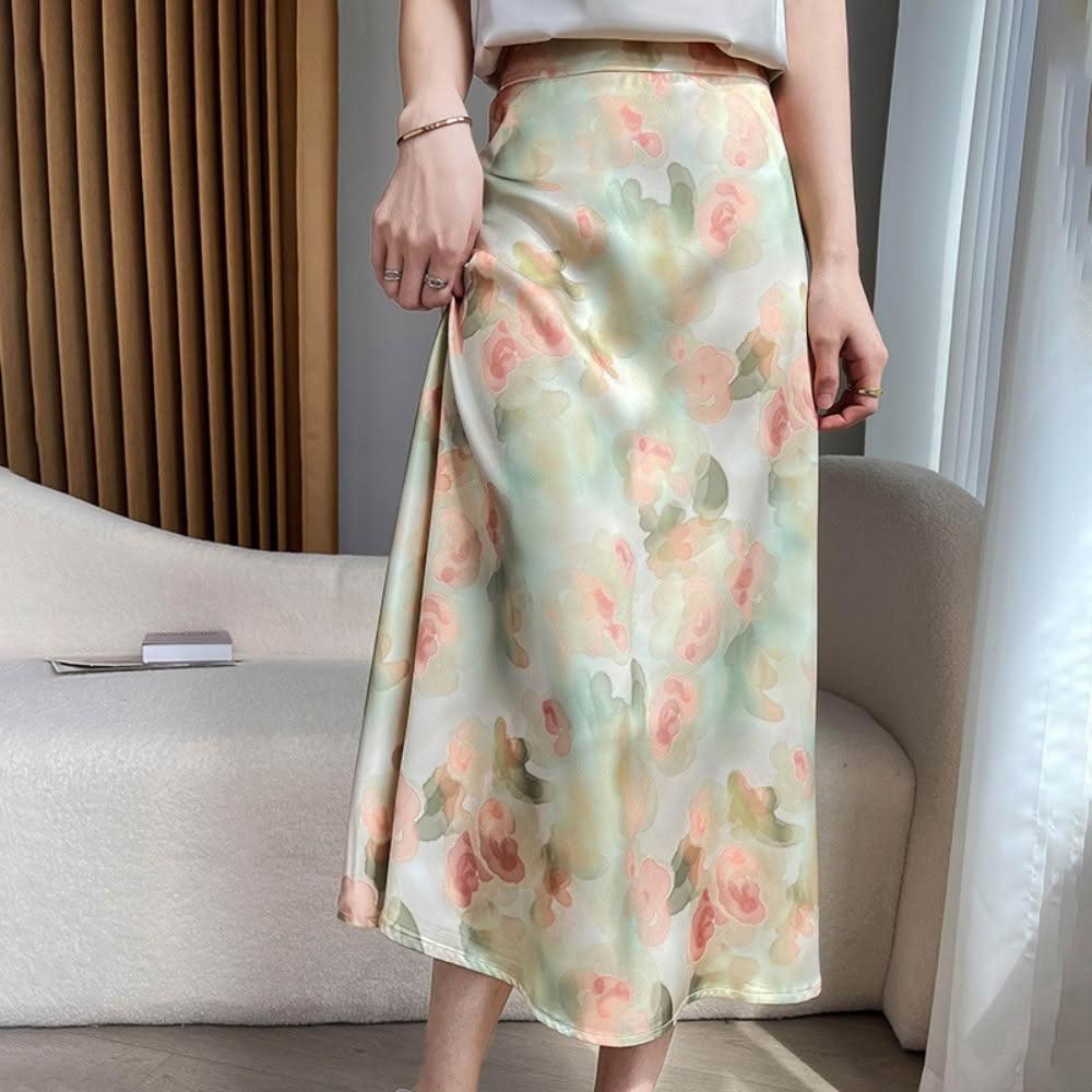 米蘭精品現貨+預購 頂級法式緞面長裙絲質裙子名媛絲綢冰絲裙絲質半身裙(油畫高腰花苞裙3色74lc89)