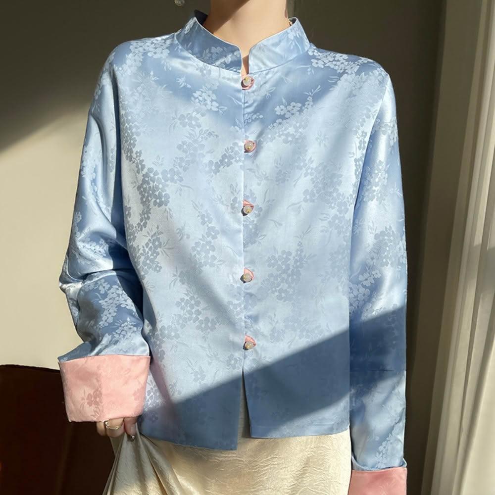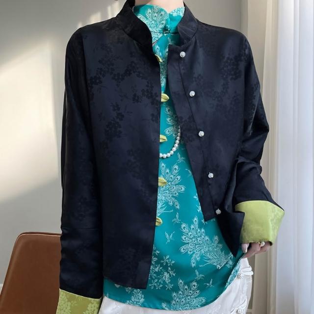 米蘭精品現貨+預購 新中式唐裝上衣緞面罩衫-絲質提花拼色袖口女外套7色74lc93