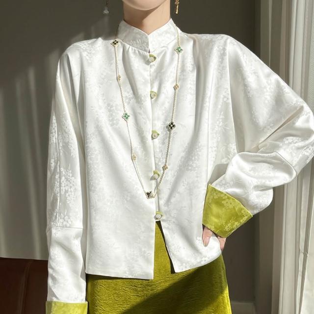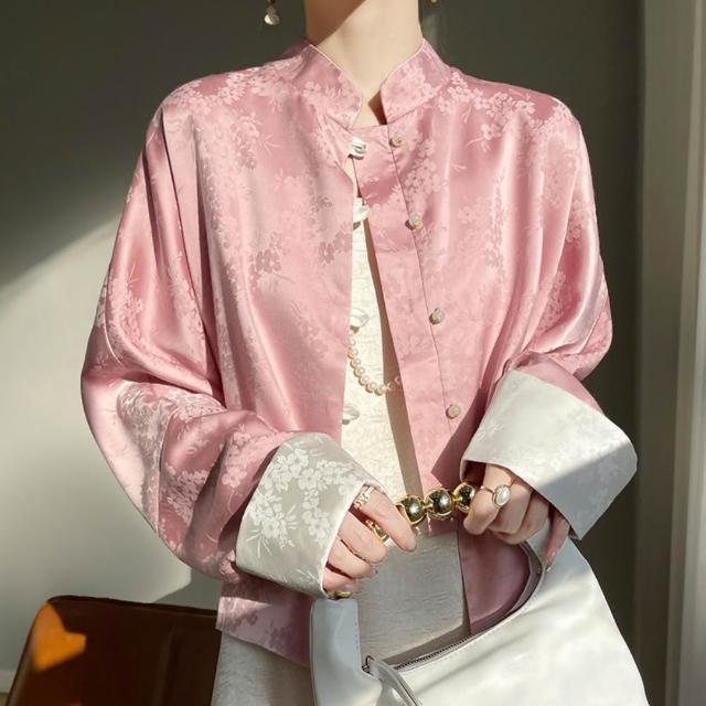 米蘭精品現貨+預購 新中式唐裝上衣緞面罩衫-絲質提花拼色袖口女外套7色74lc93