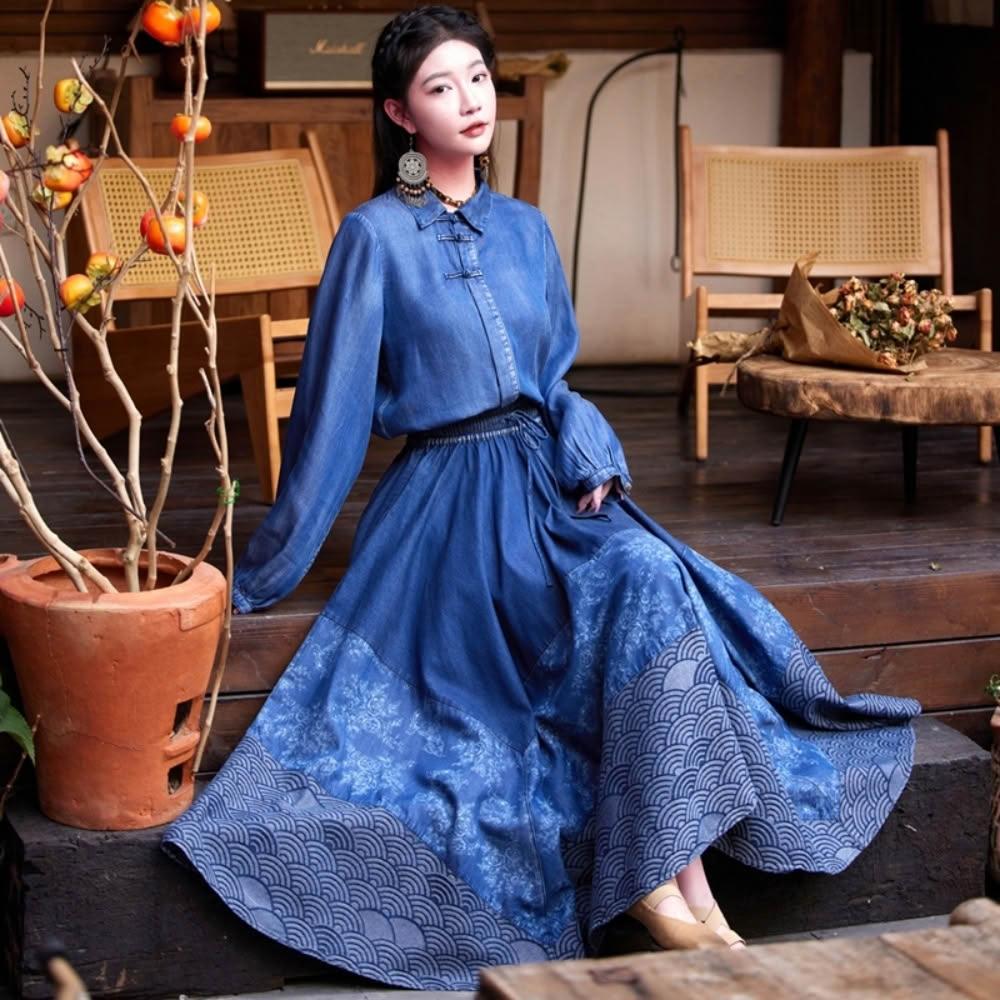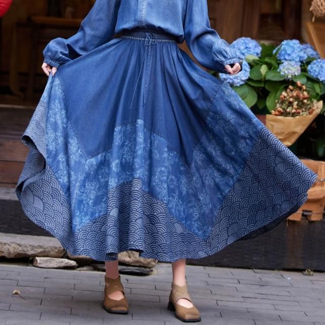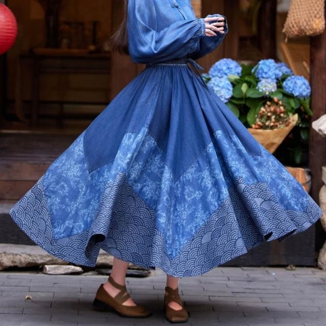 米蘭精品現貨+預購 新中式半身裙長裙高腰裙A字裙百褶裙子大碼洋裝休閒大尺碼女裝(拼接印花牛仔74ku15)