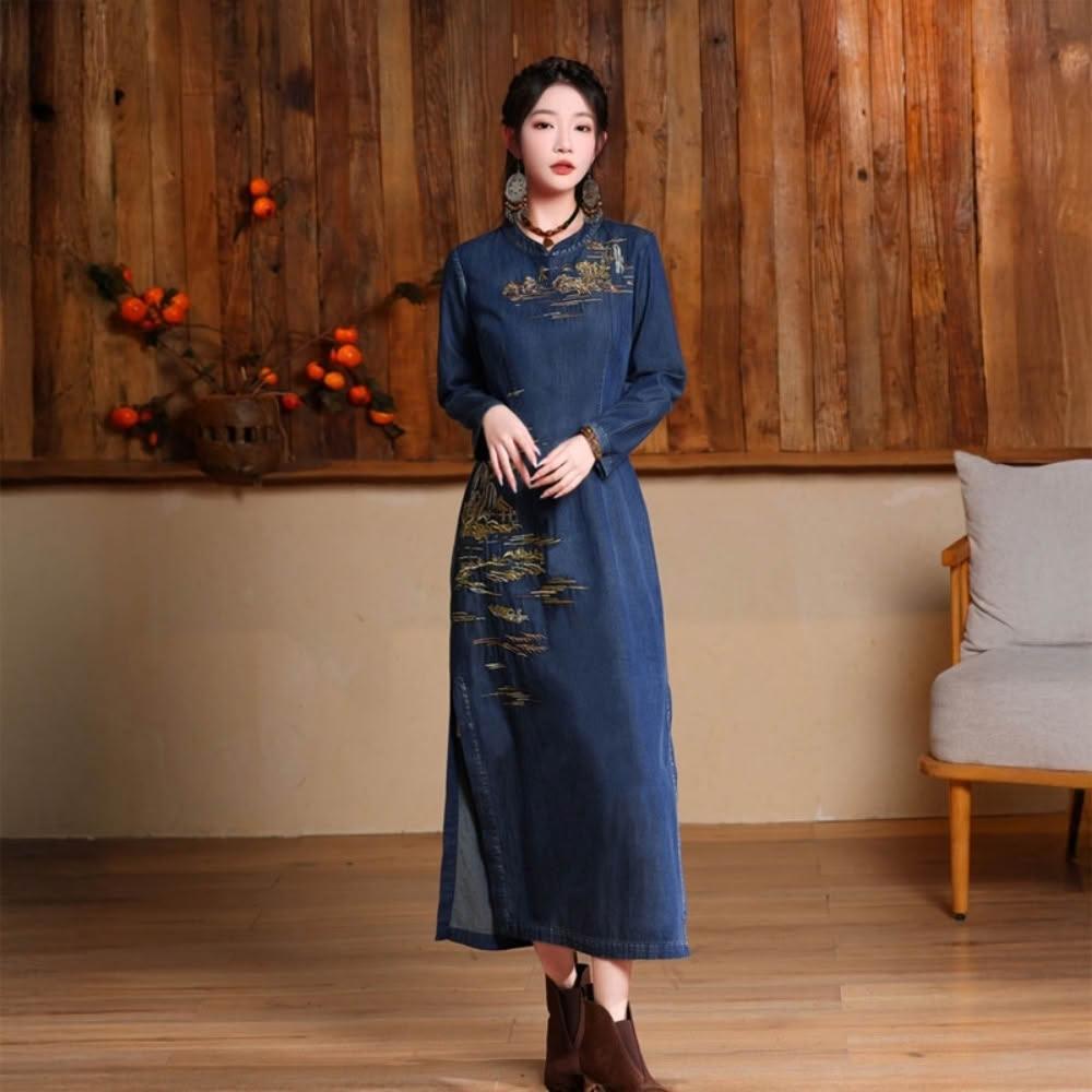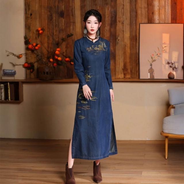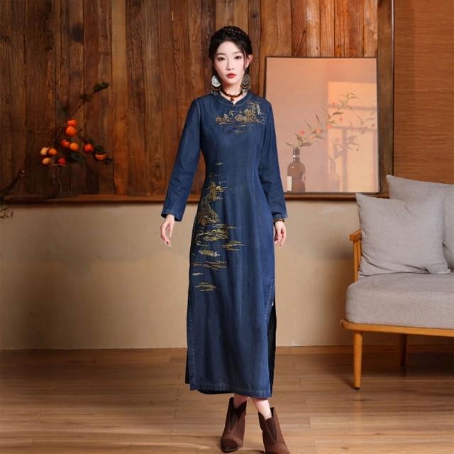 米蘭精品現貨+預購 女新中式旗袍改良旗袍長袖連身裙牛仔長裙A字裙休閒大尺碼女裝(復古刺繡開叉女裙子74ku88)