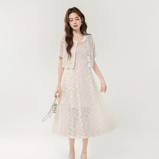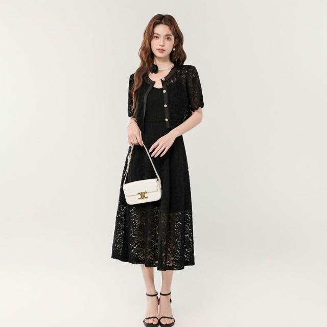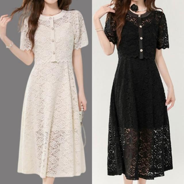 米蘭精品現貨+預購 女長洋裝長裙高級短洋裝法式連身裙蕾絲連衣裙-短袖小香風顯瘦女裙子2色74lu43