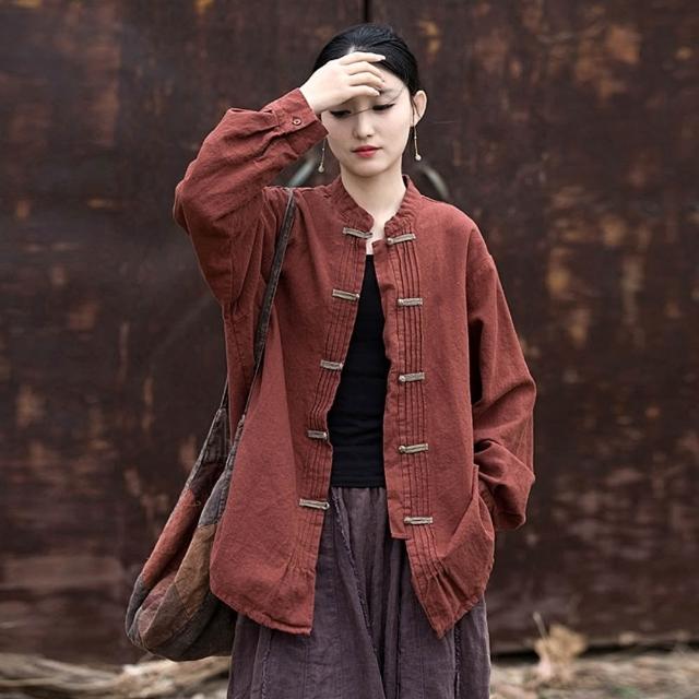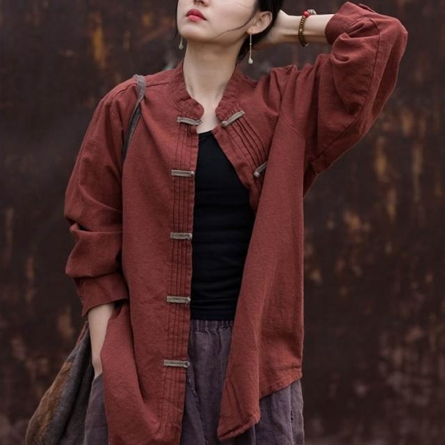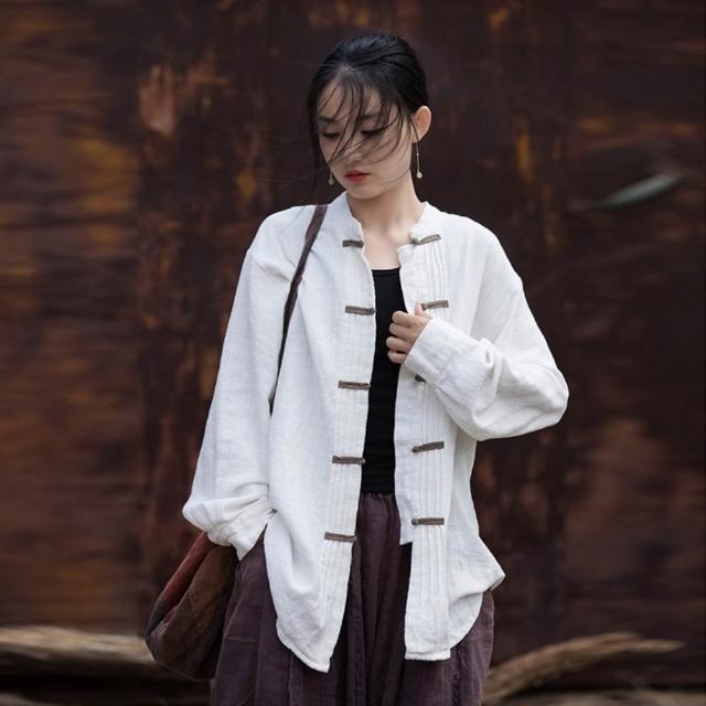 米蘭精品現貨+預購 新中式外套手工棉麻罩衫亞麻襯衫夏季女裝大尺碼-撞色盤扣女外套2色74lw23