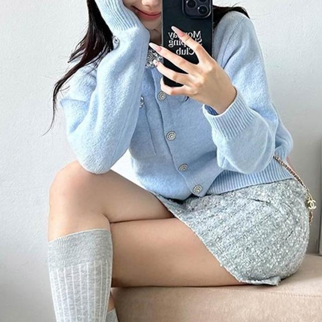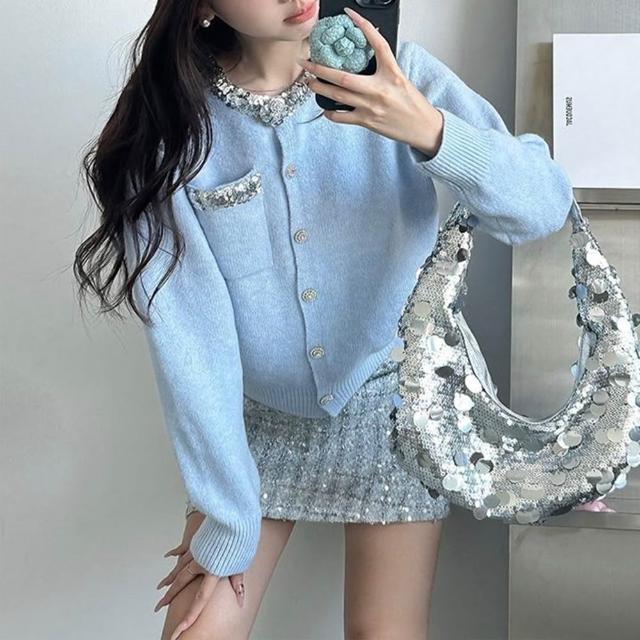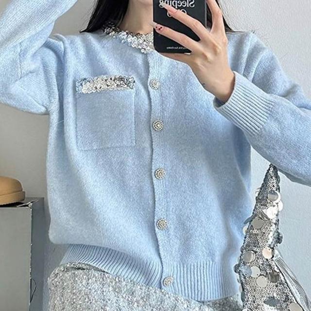 米蘭精品現貨+預購法式針織外套寬鬆上衣針織衫毛衣大碼百搭休閒女裝-小香風亮片甜美女外套藍色74mx65