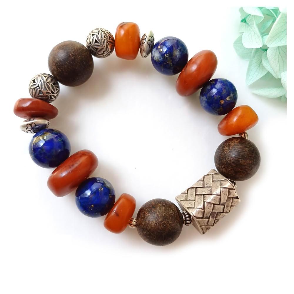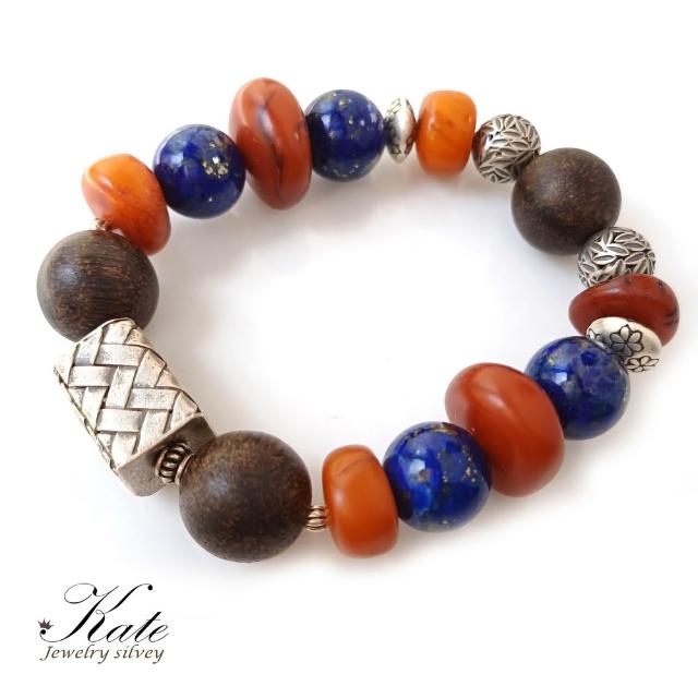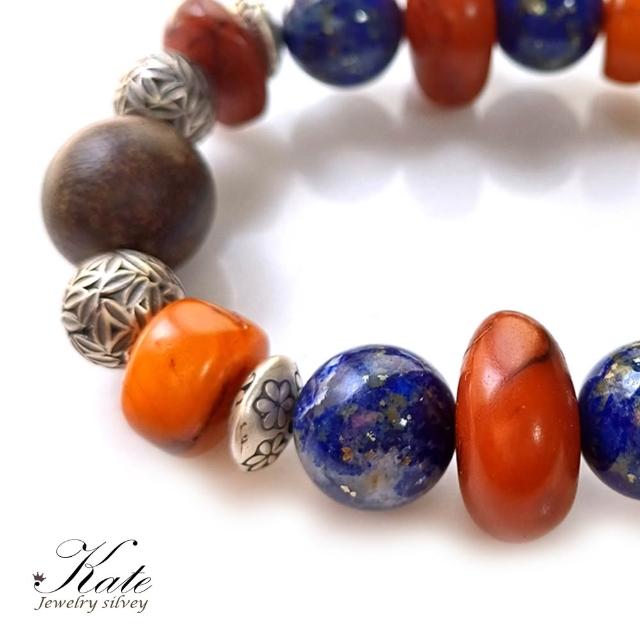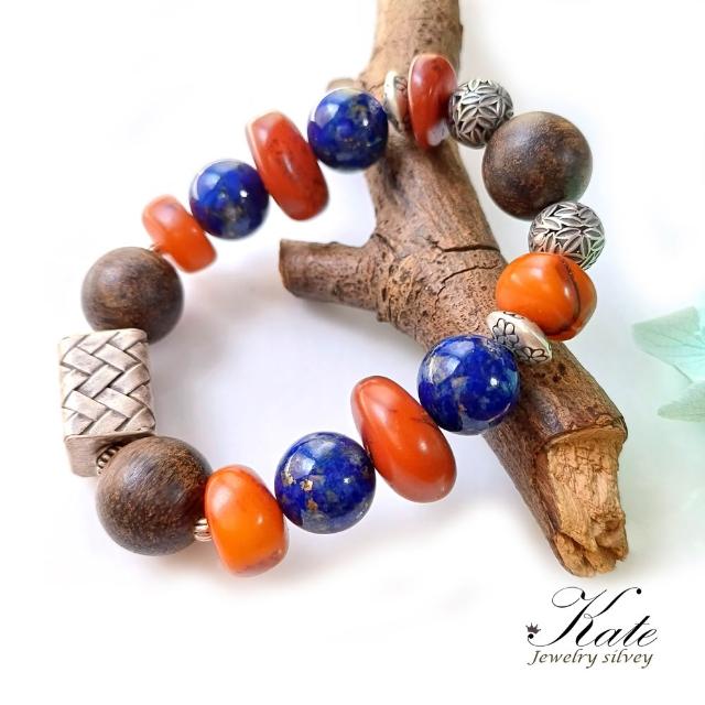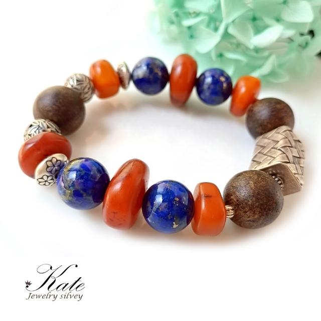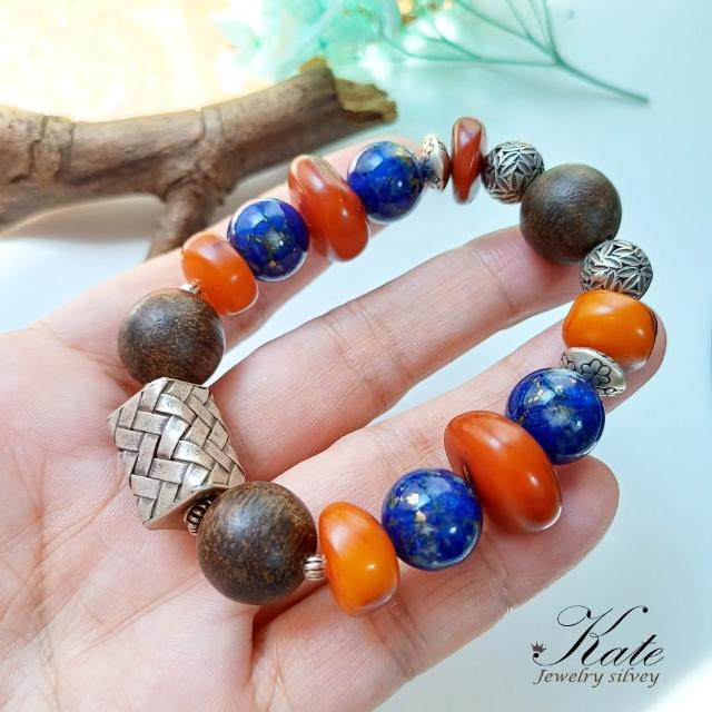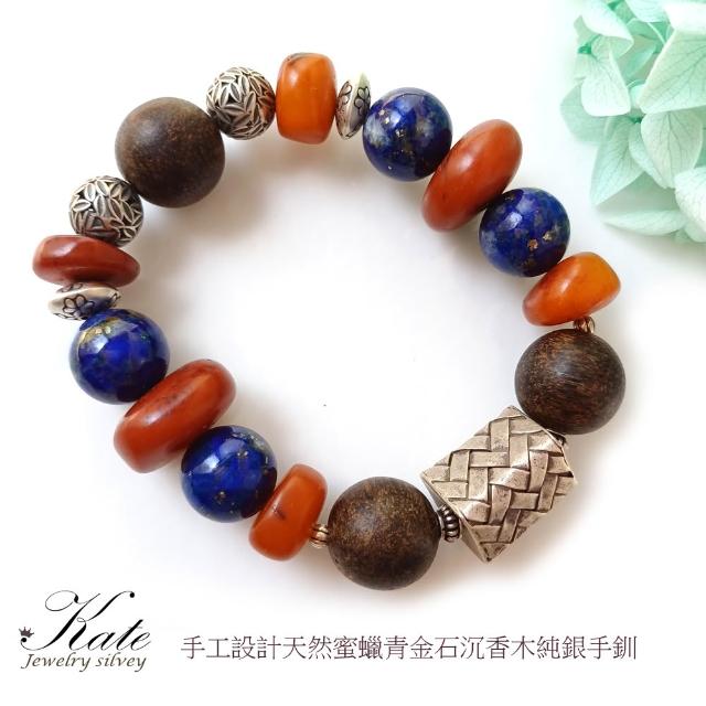 KATE銀飾 手工設計18mm天然琥珀蜜蠟純銀手環 青金石 沉香木 波羅的海琥珀蜜蠟 編織銀管 蜜蠟手珠 生日禮物 情人禮物