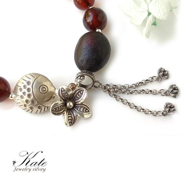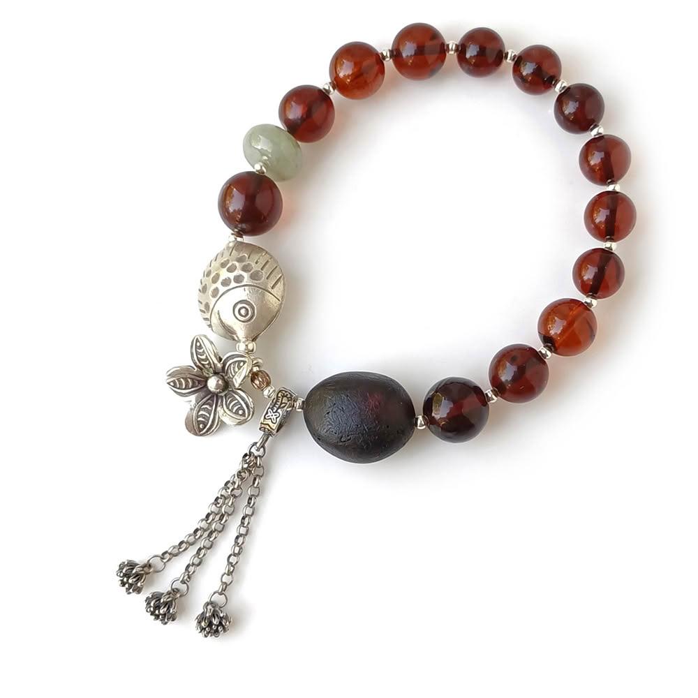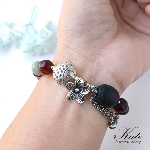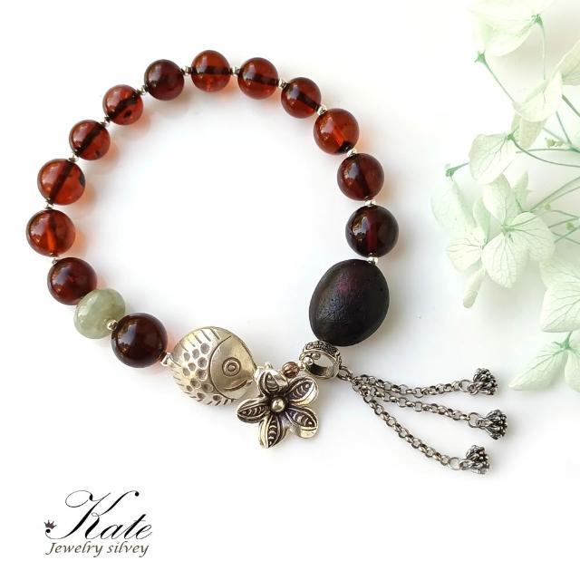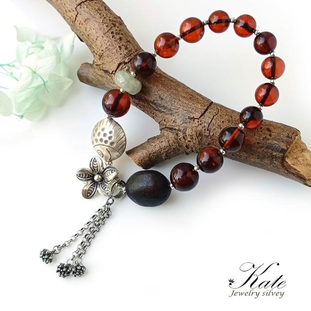KATE銀飾 手工設計天然琥珀緬甸玉純銀手鍊 波羅的海琥珀 血珀 銀魚 花朵 流蘇 翳珀 琥珀手珠 生日禮物 情人禮物