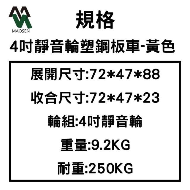 茂森 免運免安裝 MIT 4吋黃色250KG耐重塑鋼板車(靜音輪強化摺疊手推車)