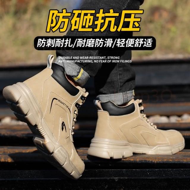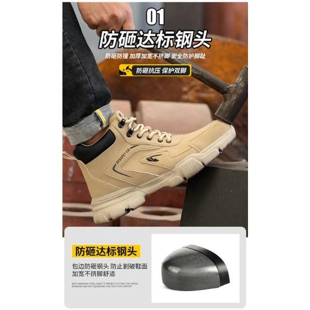 免運『現貨在台』防砸防刺穿安全鞋 時尚工作鞋 男士勞保鞋 卡其色牛皮高筒防護鞋 男士防刺穿安全鞋耐磨工作鞋 鋼頭鞋