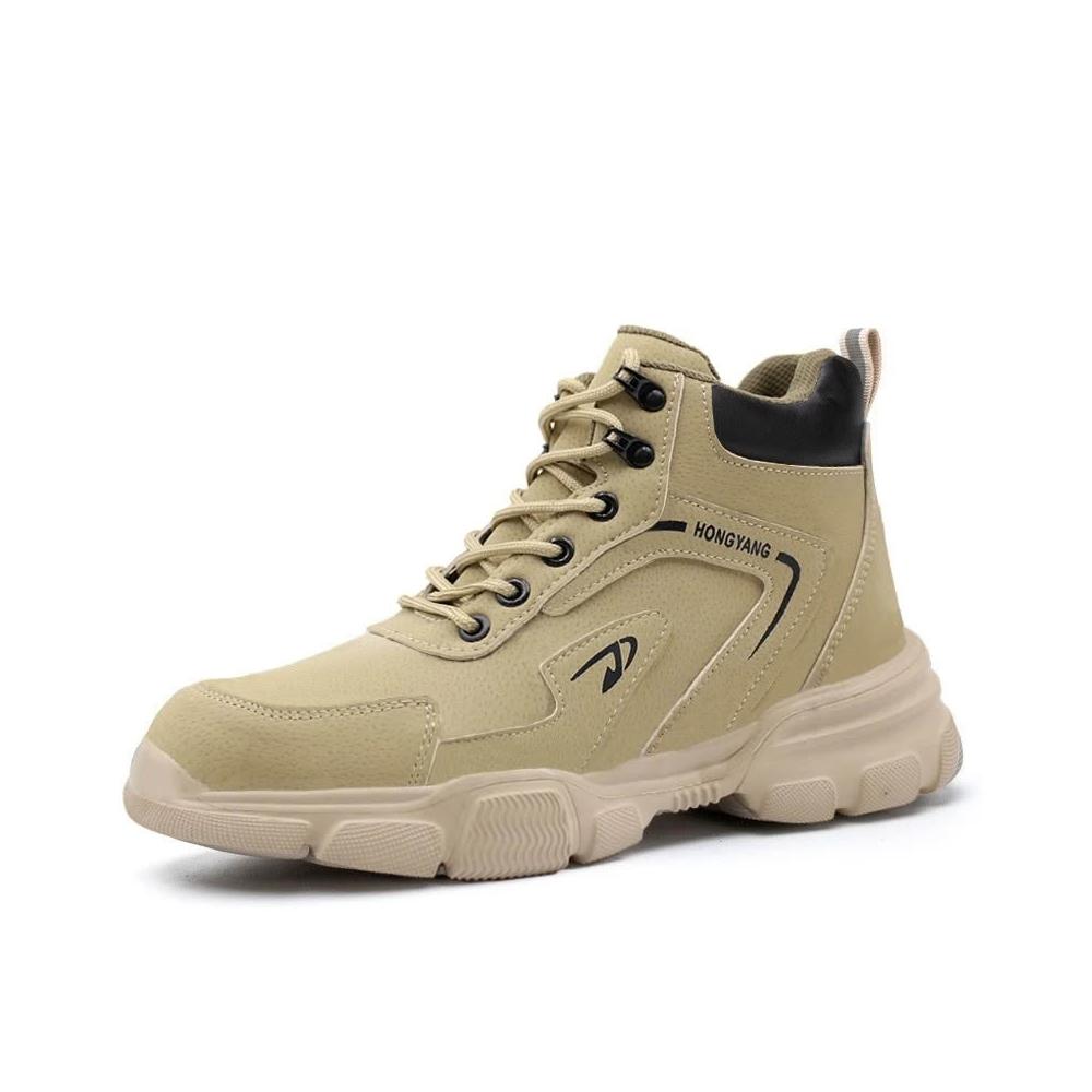 免運『現貨在台』防砸防刺穿安全鞋 時尚工作鞋 男士勞保鞋 卡其色牛皮高筒防護鞋 男士防刺穿安全鞋耐磨工作鞋 鋼頭鞋