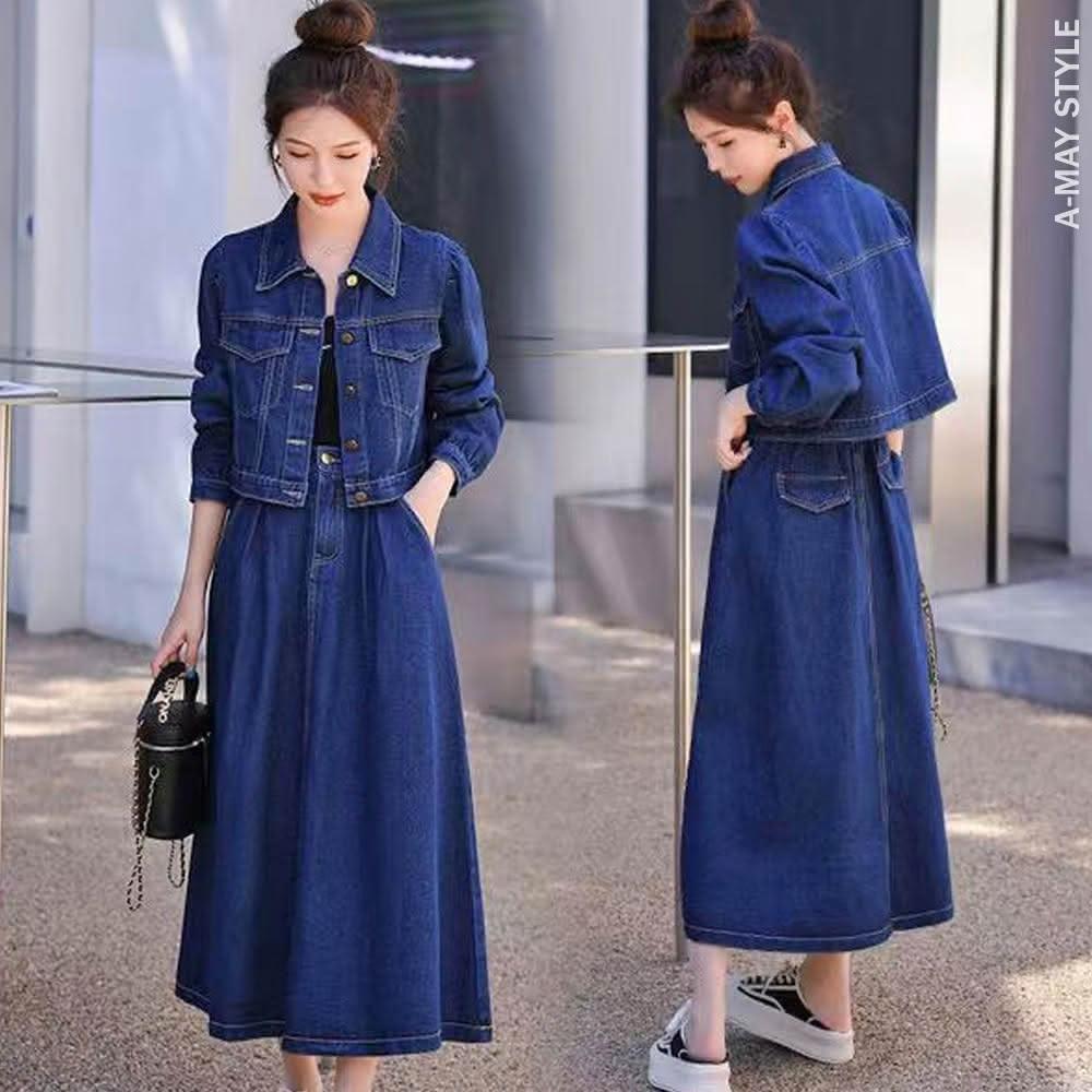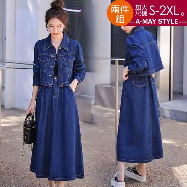 Amay Style 艾美時尚免運 中大尺碼女裝 套裝 丹寧 兩件式慵懶時尚牛仔裙裝。S-2XL(藍.現貨+預購)