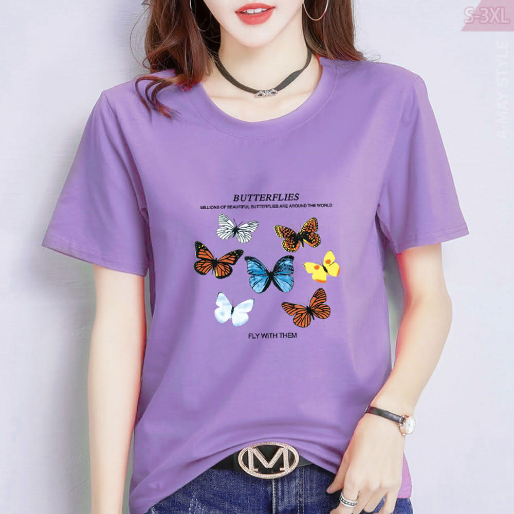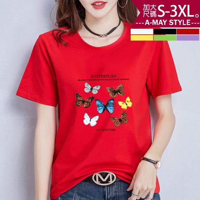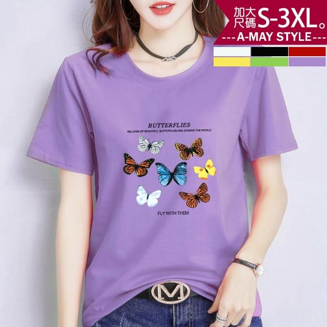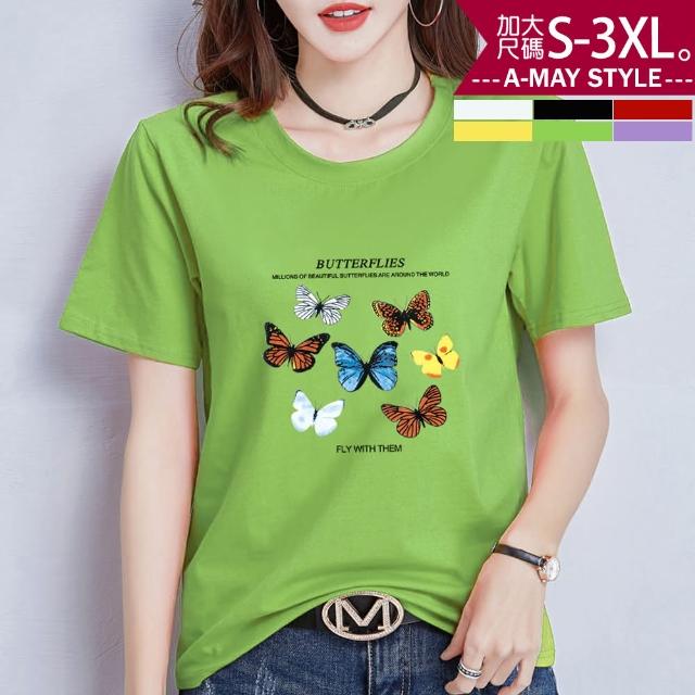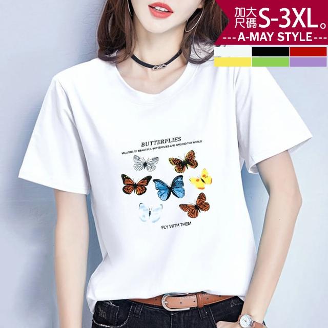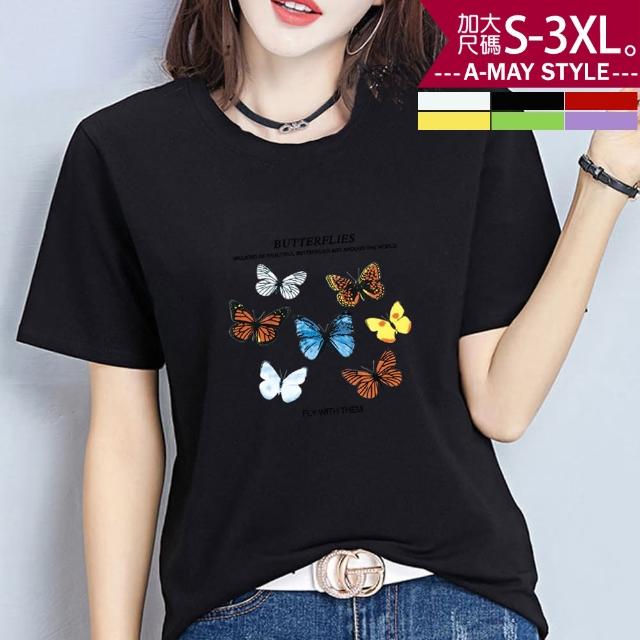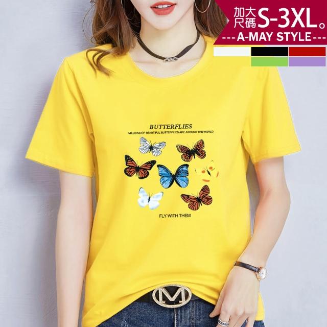 Amay Style 艾美時尚中大尺碼女裝 上衣 蝶之戀時尚印花彈力牛奶絲短袖T恤。S-3XL(6色.預購)