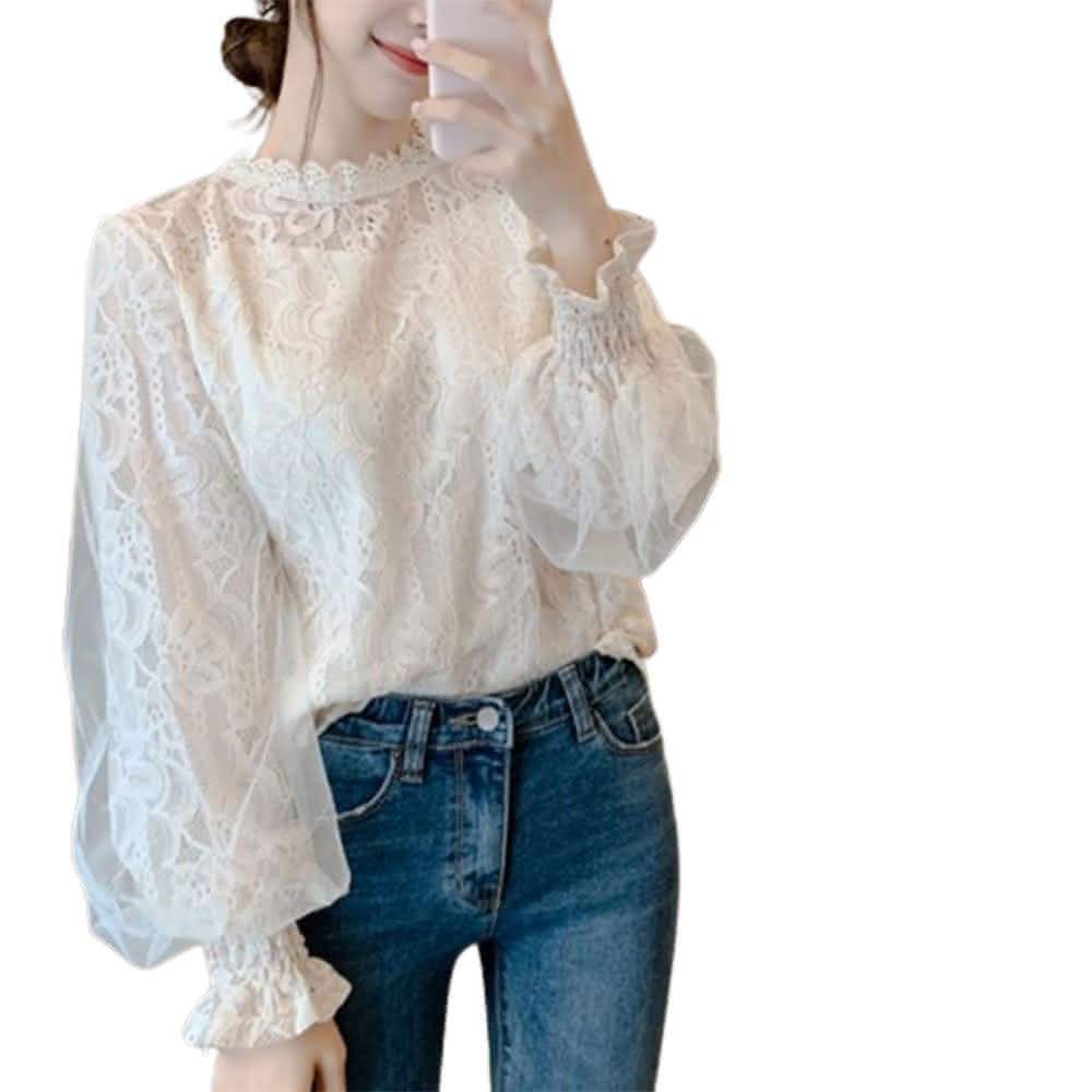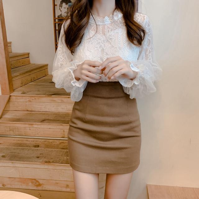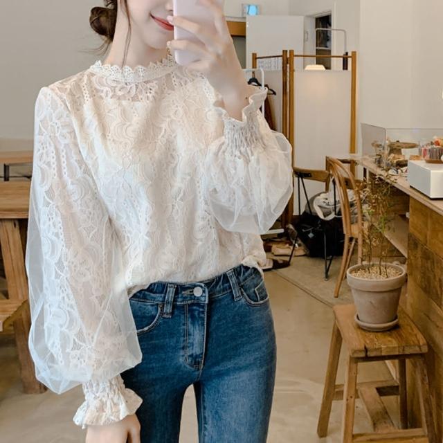 BBHONEY韓版氣質寬鬆網紗蕾絲燈籠袖上衣(白/杏)