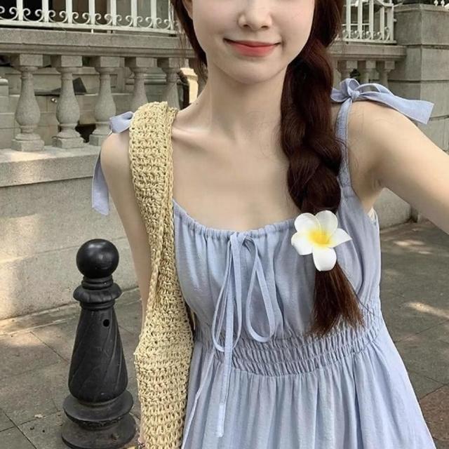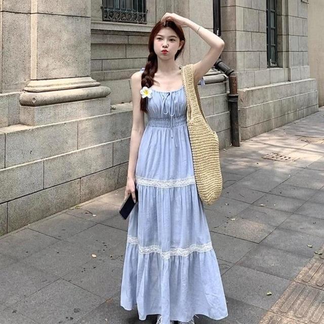 韓風 蕾絲拼接 蛋糕吊帶裙渡假長洋(夏日長裙)