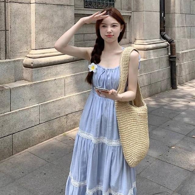 韓風 蕾絲拼接 蛋糕吊帶裙渡假長洋(夏日長裙)