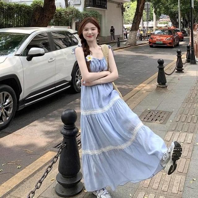 韓風 蕾絲拼接 蛋糕吊帶裙渡假長洋(夏日長裙)