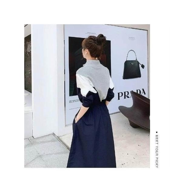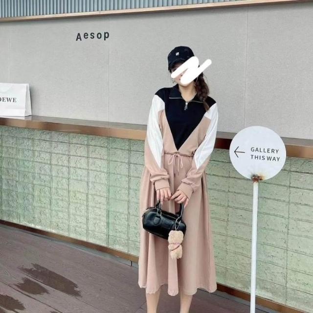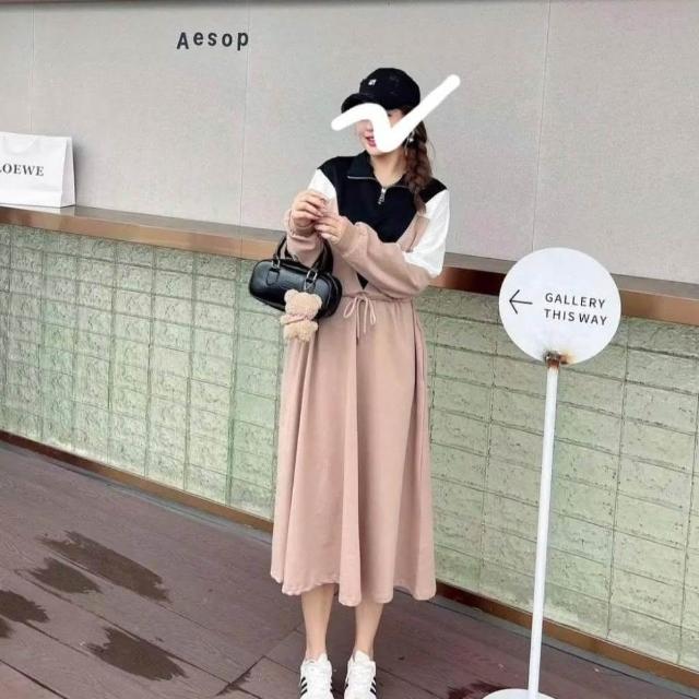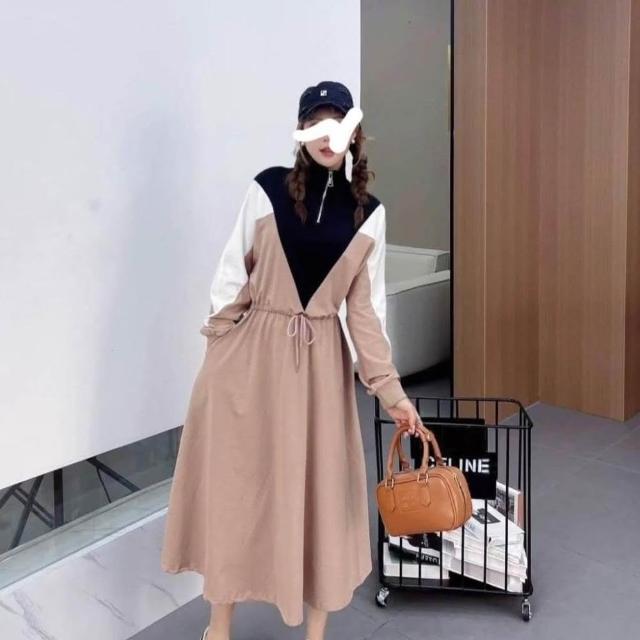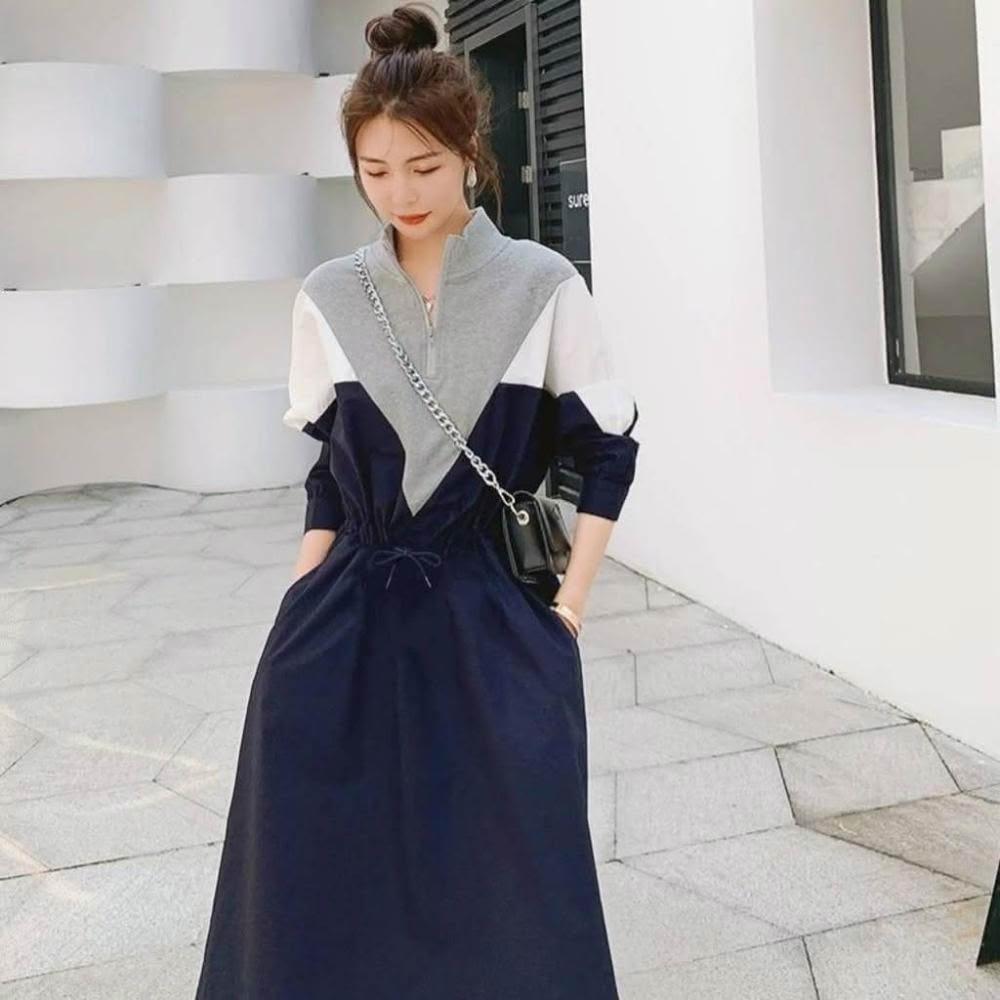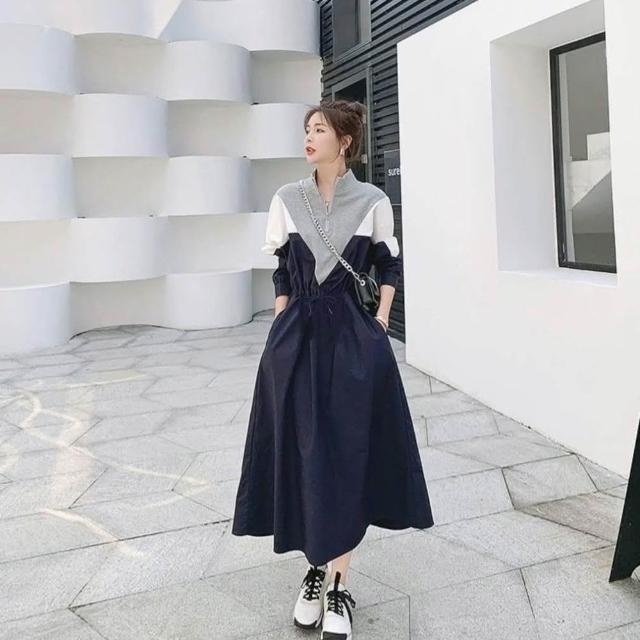 BBHONEY韓風 拉鍊小立領撞色抽繩收腰連身裙 長袖棉裙