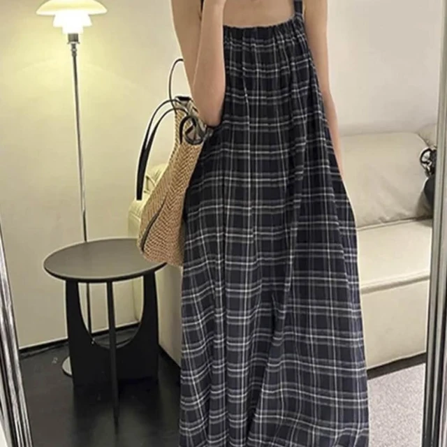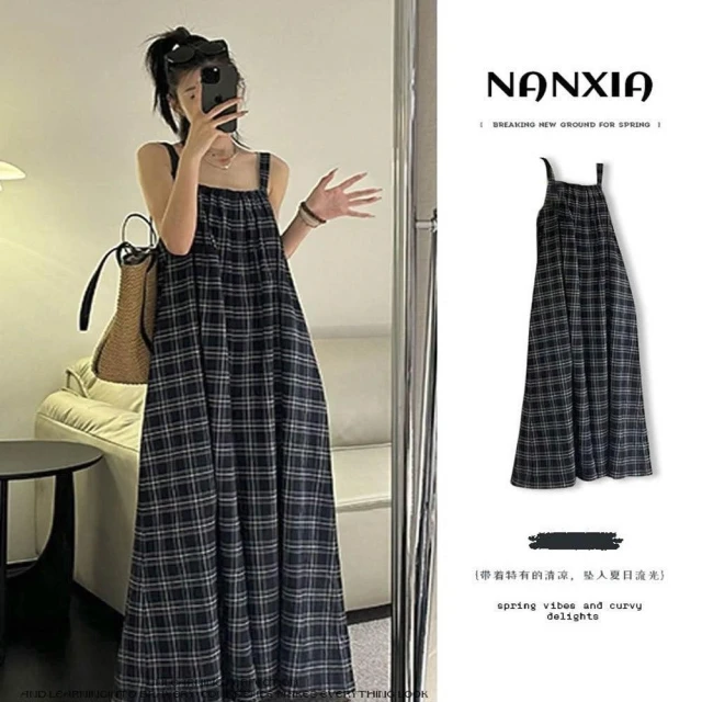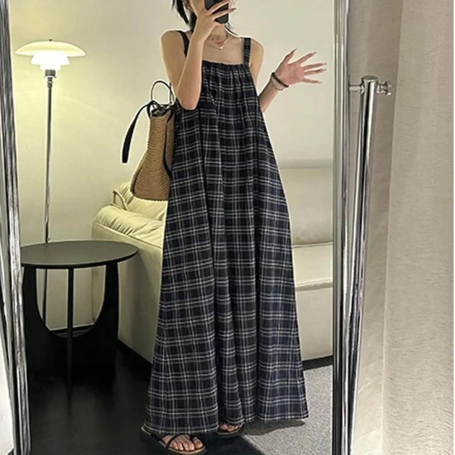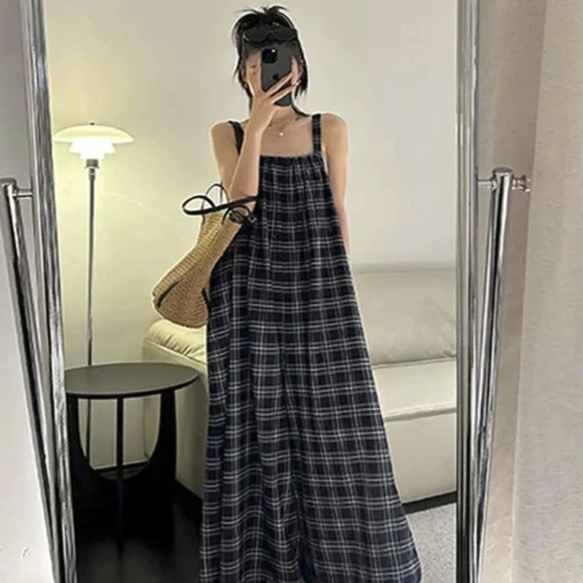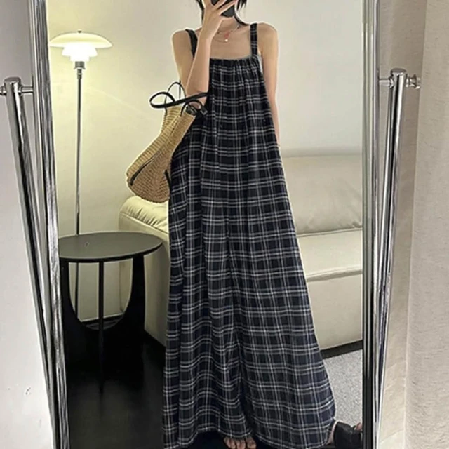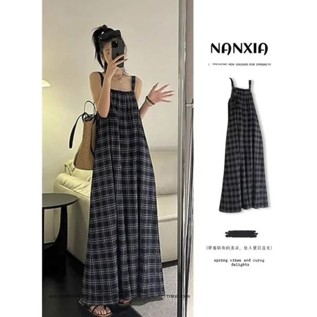 BBHONEY法式慵懶風百搭減齡格子寬鬆 吊帶寬褲