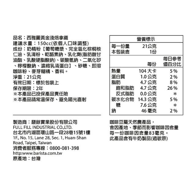西雅圖黃金淺焙拿鐵三合一21g×100入/袋裝
