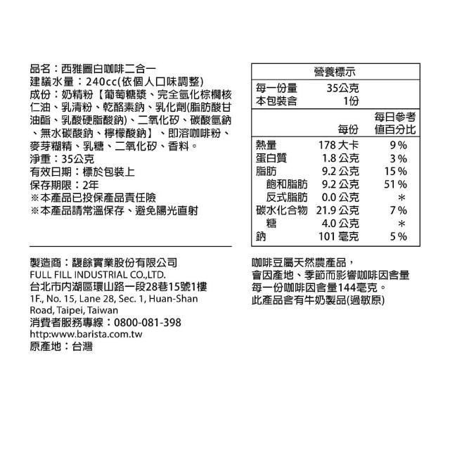西雅圖南洋風白咖啡二合一35g×30入/袋裝