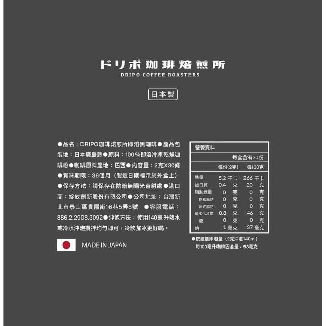 Dripo咖啡焙煎所即溶黑咖啡2g×30入/盒裝