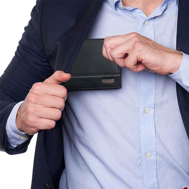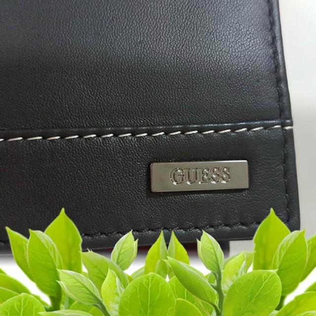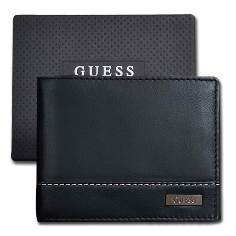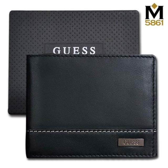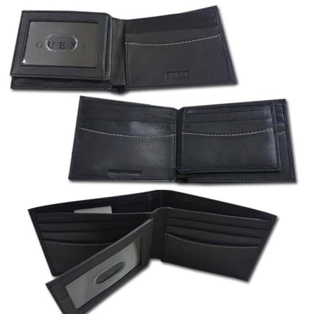 GUESS男皮夾 短夾 牛皮夾 雙排設計 金屬銘標LOGO 多卡夾 大鈔夾 品牌盒裝/黑色(男夾短夾男皮夾)