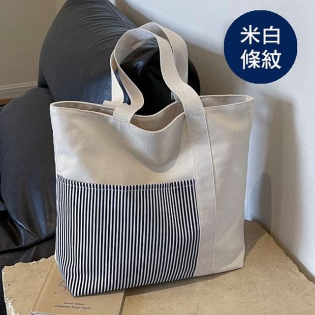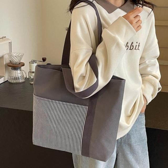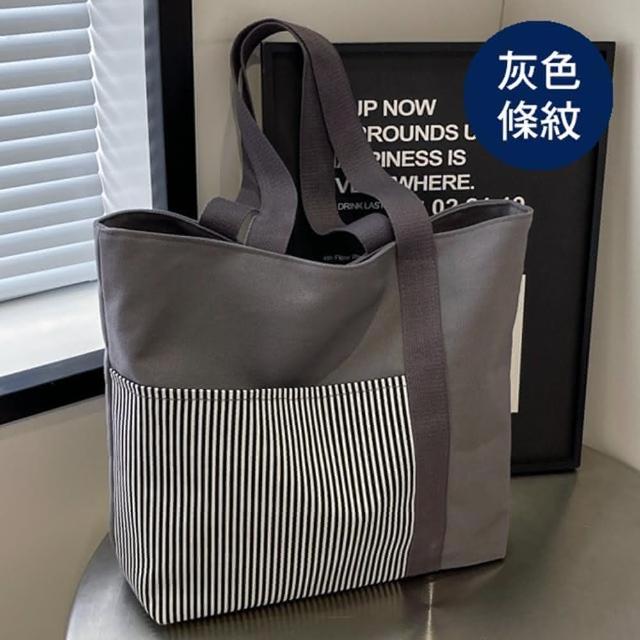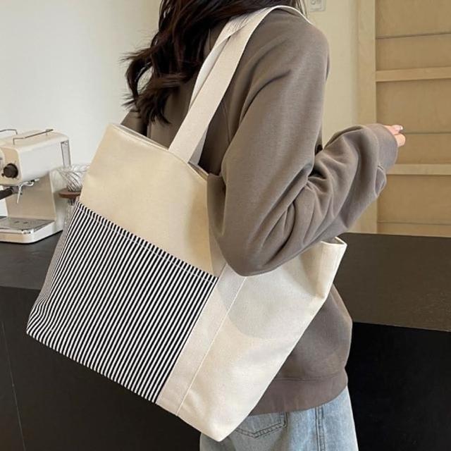 帆布包 純棉 帆布袋 條紋拼接 肩背/拉鍊/多色可選(帆布袋肩背側背斜背)