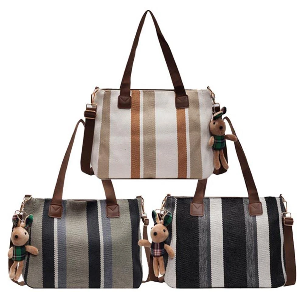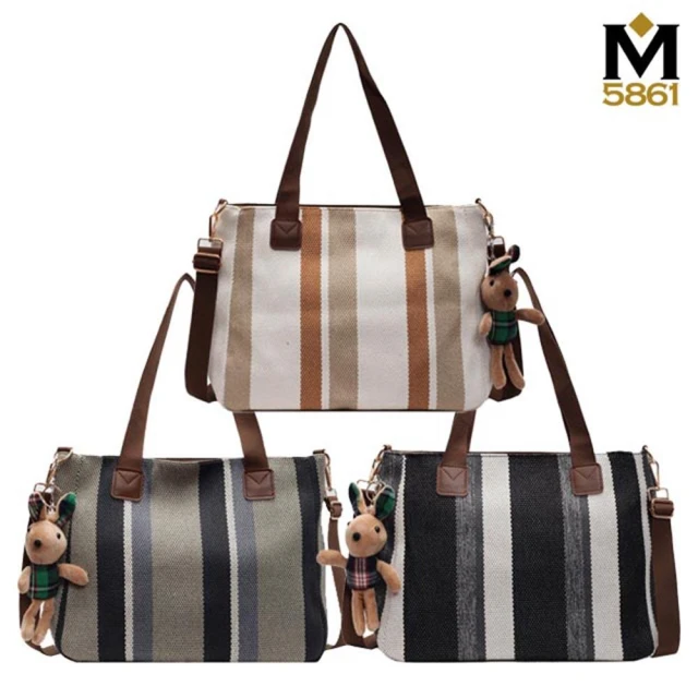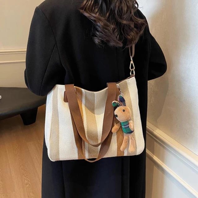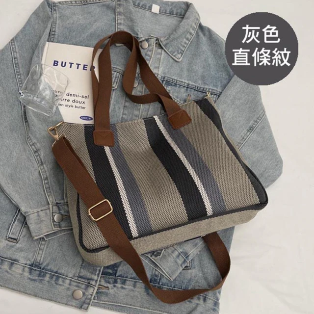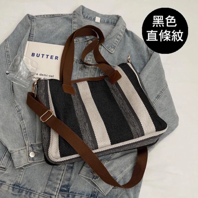 帆布包 帆布袋 直條紋撞色 編織帆布 側肩背 斜背/拉鍊/多色可選(不含布偶)(側肩背斜背包)