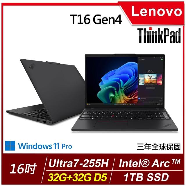 ThinkPad 聯想T16 Gen4 16吋輕薄商務AI筆電(Ultra7-255H/32G+32G/1TB/W11P/三年保)特仕