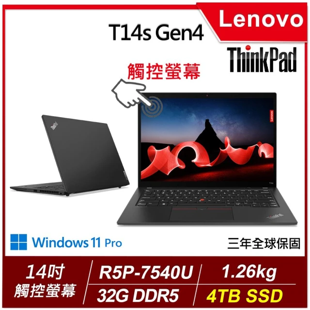 ThinkPad 聯想T14s Gen4輕薄1.26kg觸控商務筆電(R5P-7540U/32G/4TB/W11P/三年保)特仕